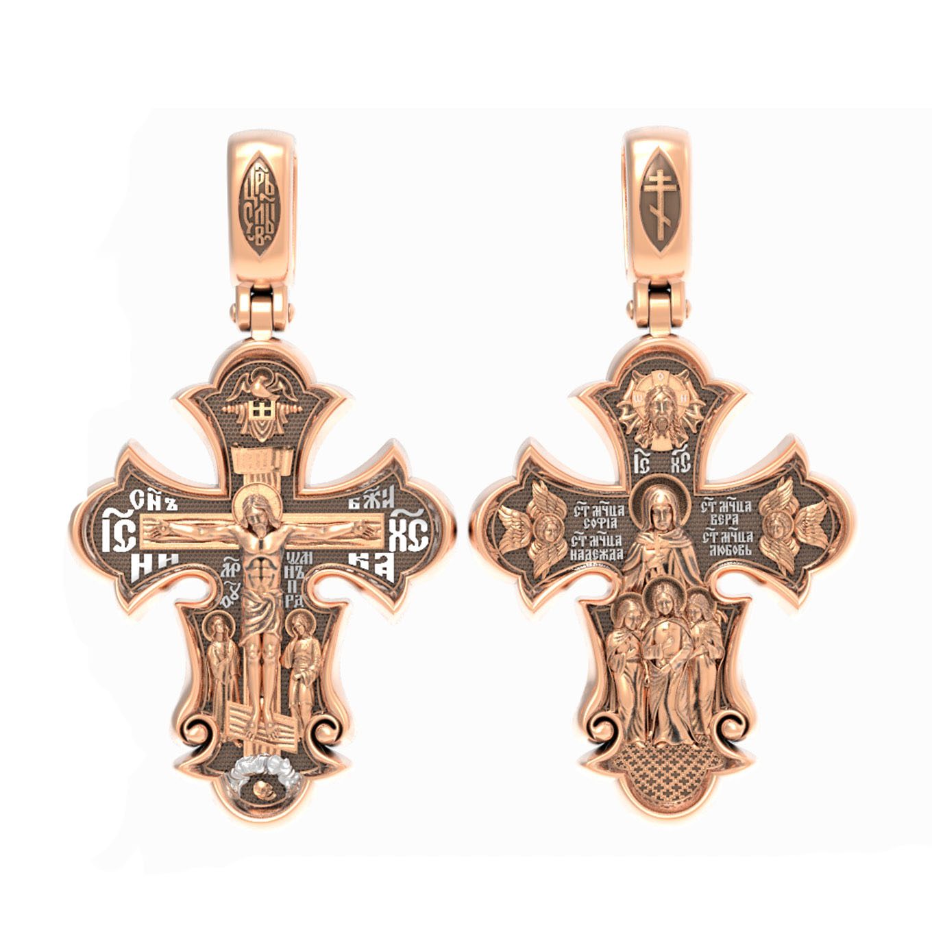 На оборотной стороне креста изображены Святые мученицы Вера, Надежда, Любовь и матерь их София, жившие во 2 веке нашей эры в Римской империи. Известно, что София была родом из Милана. Она рано овдовела, после чего перебралась в Рим. Своих дочерей София воспитывала в христианской вере и даже дала им имена в честь главных христианских добродетелей — Вера, Надежда и Любовь. В те годы римское государство жестоко преследовало верующих во Христа. Маленьких девочек (старшей Вере тогда было всего 12, а младшей Любови лишь 9) арестовали, подвергли истязаниям, а затем умертвили на глазах их матери. Сама София скончалась на следующий день у могилы своих дочерей. Но трагическая судьба на земле обернулась для мучениц вечной славой в ином мире. Церковь причислила их к лику святых и сегодня по молитвам к ним происходят чудеса. Выше образов мучениц изображен Спас Нерукотворный — образ Господа и Спасителя нашего Иисуса Христа, чудесно отпечатавшийся на плате, котором Христос вытер свой лик. По обеим сторонам креста изображены Ангелы Серафимы. На кулонном кольце помещен крест.