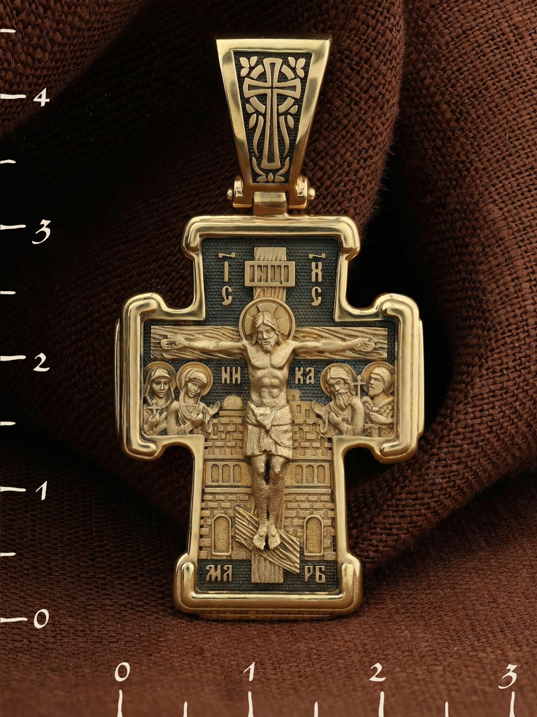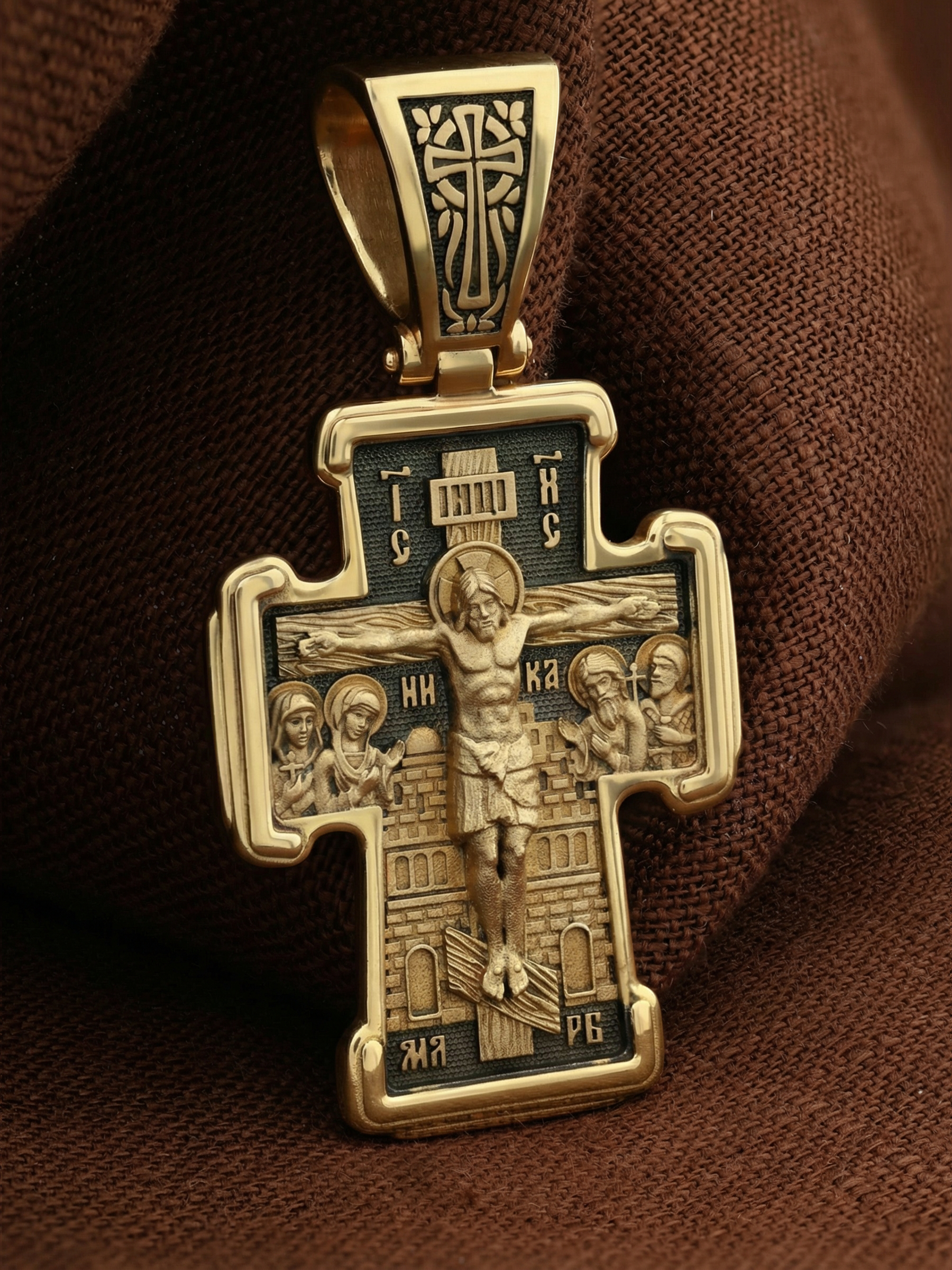 На лицевой стороне креста изображено Распятие Господа и Спасителя нашего Иисуса Христа. Крест- символ спасения и искупления рода человеческого, знамение победы над смертью и адом. Иисус Христос, как искупительная жертва освобождения человечества от власти греха, умер крестной смертью и в третий день воскрес. На верхней табличке, выше головы Иисуса, расположена надпись, составленная Понтием Пилатом — «IНЦI». Она означает «Иисус Назорей, Царь Иудейский». Рядом расположена надпись «IС» « ХС». Она означает Иисус Христос. Ниже — слово «НИКА», что означает «победитель». Слева от Распятия — Пресвятая Богородица и святая мироносица Мария Магдалина с крестом в руке. Справа — апостол и евангелист Иоанн Богослов, один из ближайших учеников Иисуса Христа, и сотник Лонгин с крестом в правой руке и копьем — в левой. За крестом высится Иерусалимская стена. Надпись «МЛРБ» — «место лобное рай бысть» означает, что место лобное стало раем, помещается в нижней части креста. На кулонном кольце помещен крест.