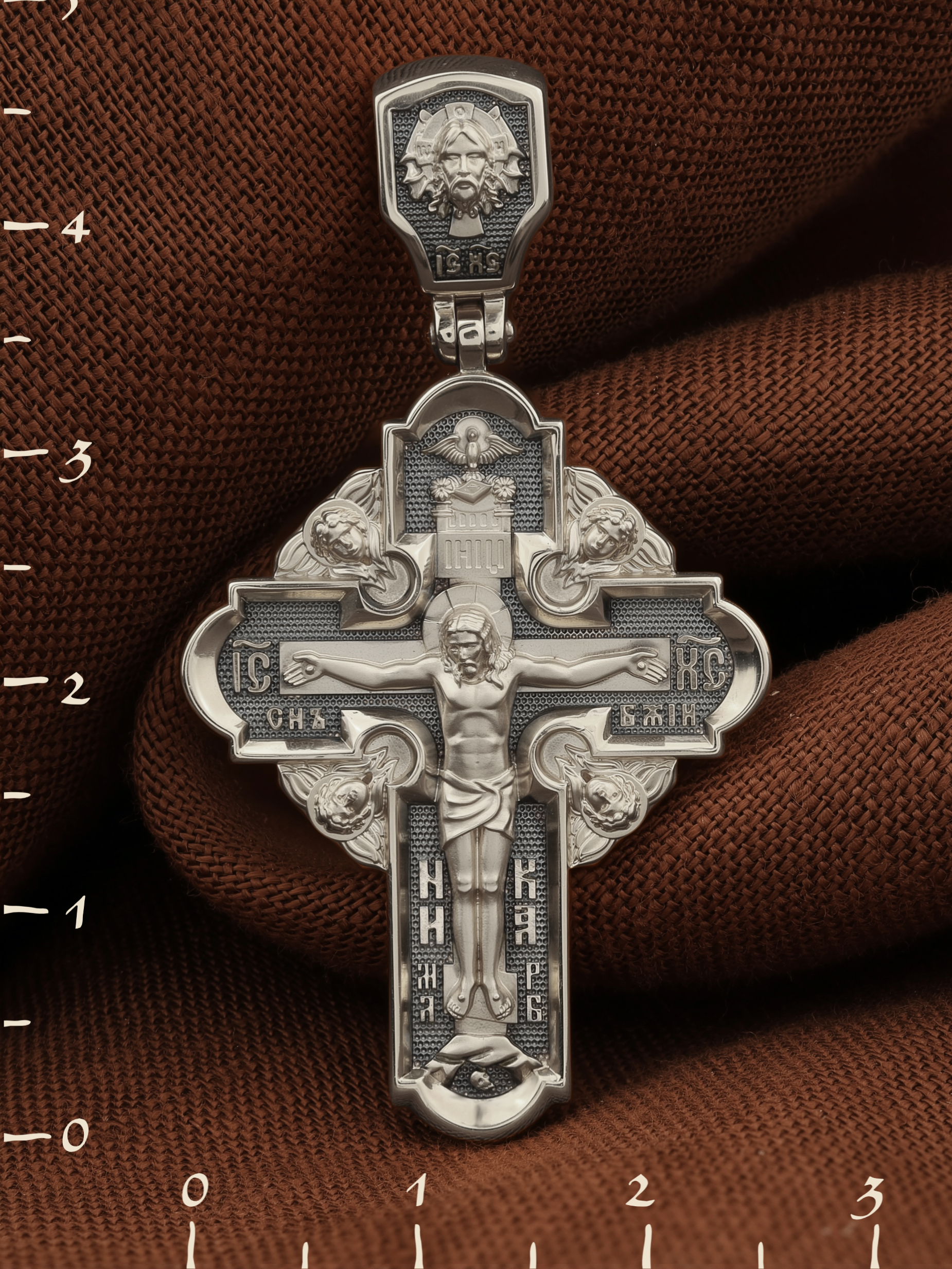 На лицевой стороне креста изображено Распятие Господа и Спасителя нашего Иисуса Христа. Крест- символ спасения и искупления рода человеческого, знамение победы над смертью и адом. Верхняя перекладина символизирует титло — табличку, на которой, согласно Евангелию, было начертано: Иисус Назорей Царь Иудейский (IНЦI). Надпись «IC» «ХC», означает Иисус Христос, помещается на разных сторонах поперечной перекладины креста. Ниже перекладины расположено словосочетание «СЫН БОЖИЙ», что означает божественную природу Иисуса Христа. Надпись «МЛРБ» — «место лобное рай бысть» означает, что место лобное стало раем и помещаются в нижней части креста. Рядом — слово «НИКА», что означает «победитель». Возвышение, на котором стоит Крест, символизирует гору Голгофу, на которой произошло Распятие. Под подножием Креста изображена покоящаяся голова (череп) Адама. На кулонном кольце изображен Нерукотворный образ Господа и Спасителя нашего Иисуса Христа, чудесно отпечатавшийся на плате, которым Христос вытер свой лик.