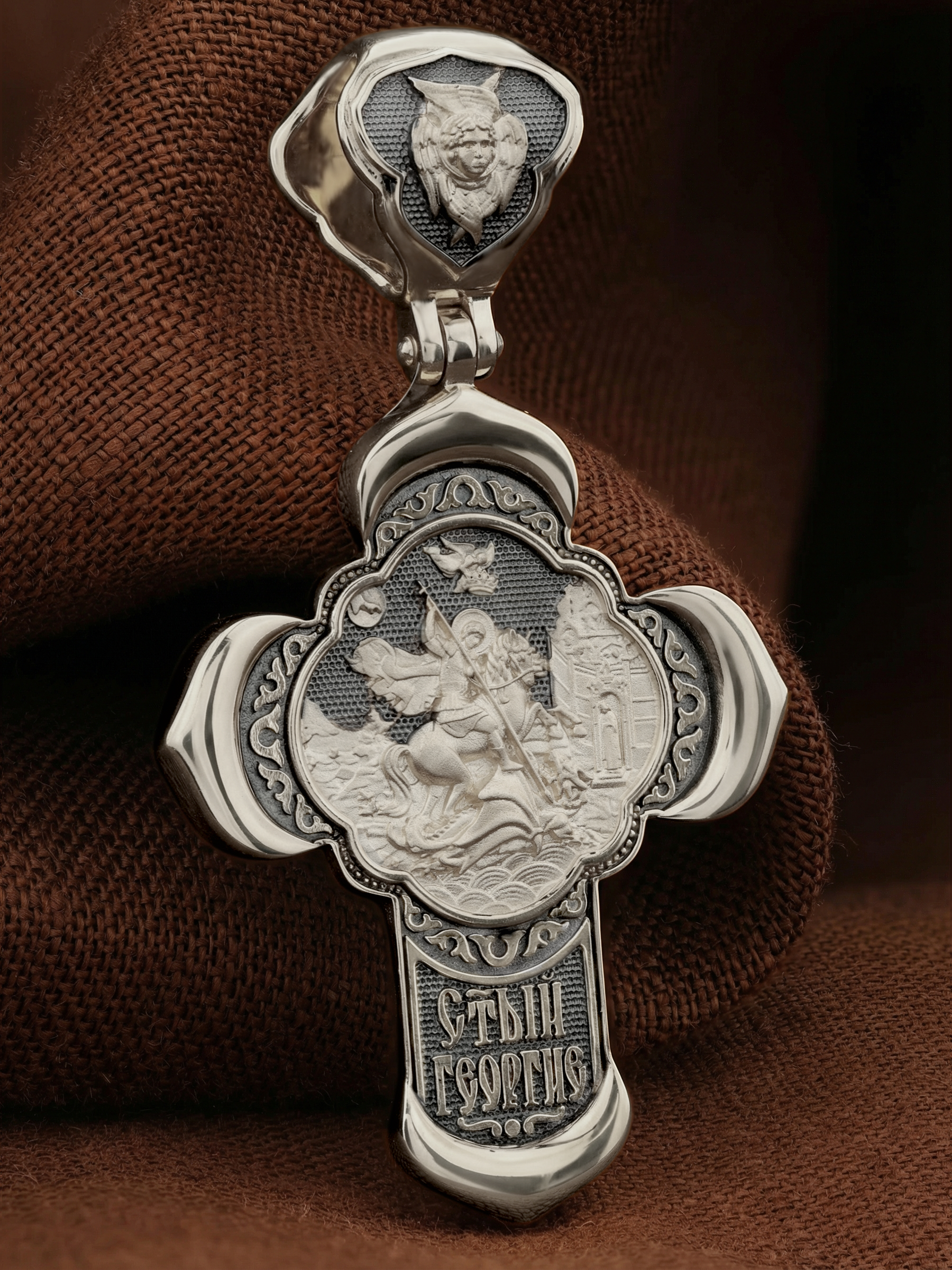 На оборотной стороне креста помещено изображение Святого Великомученика Георгия Победоносца — одного из самых почитаемых и удивительных святых. Георгий родился в Каппадокии (Малая Азия) в семье богатых и знатных горожан. Юношей поступил на службу к римскому императору Диоклетиану, за отличное знание военного дела и проявленную в боях и походах храбрость был приближен к императору и удостоен высокого воинского звания. Во время начавшихся гонений на христиан, перешел на сторону гонимых и, отвергнув человеческий страх, стал ярым проповедником учения Христа. Мучители подвергли опального воеводу жесточайшим восьмидневным пыткам и казнили его (обезглавили) в возрасте около тридцати лет в 303 году. Георгий изображен как воитель, сидящий на вздыбленном коне и поражающий копьем огнедышащего змея. Слева над образом изображена благословляющая Божия десница. Над святым изображен ангел возлагающий на него венец мученика. Змей символизирует собою сатанинские силы. Молитвами вознесенными к Всевышнему и своей непреклонной верой он смог одолеть чудовище. Святой убил змея, спас царскую дочь, принесенную в жертву, и жителей города, их души от влияния дьявола, породив в них надежду и веру в Господа, призывая людей принять христианскую веру. На кулонном кольце изображен шестикрылый Ангел — Серафим.