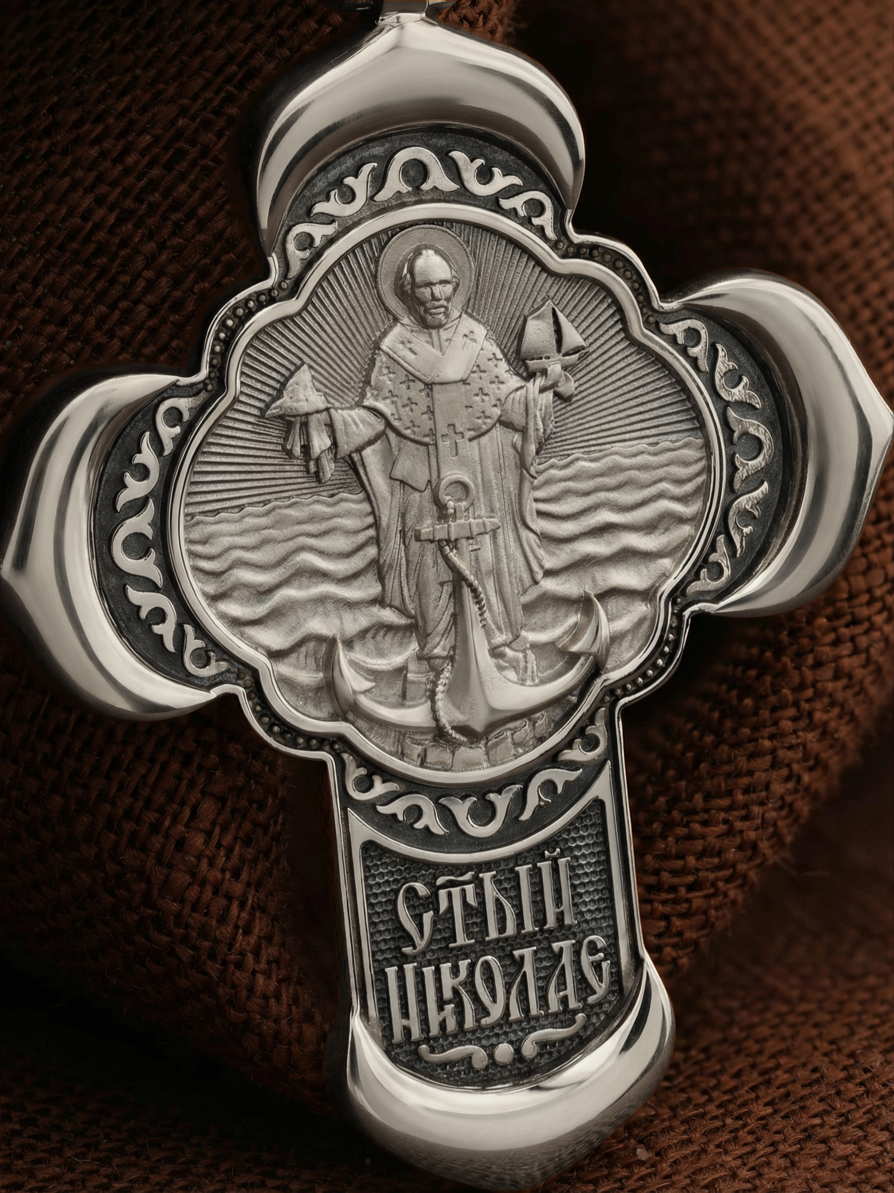 На лицевой стороне креста изображено Распятие Господа и Спасителя нашего Иисуса Христа, отдавшего Себя на смерть, для искупления грехов мира. Крест является символом жертвенной любви Всеблагого Бога к падшим людям, всепобеждающим духовным оружием христиан, основанием и средоточием церковной жизни. Господь сказал: «кто хочет идти за Мною, отвергнись себя, и возьми крест свой, и следуй за Мною». (Мк. 8: 34). На верхней табличке, выше головы Иисуса, расположена надпись, составленная Понтием Пилатом — «IНЦI». Она означает «Иисус Назорей, Царь Иудейский». Надпись «IC» «ХC», означает Иисус Христос, помещается на разных сторонах поперечной перекладины креста. Крест стоит на горе камней, символизирующих Голгофу. В ее основании различается череп– это голова Адама. На кулонном кольце изображен Нерукотворный образ Господа и Спасителя нашего Иисуса Христа, чудесно отпечатавшийся на плате, которым Христос вытер свой лик.