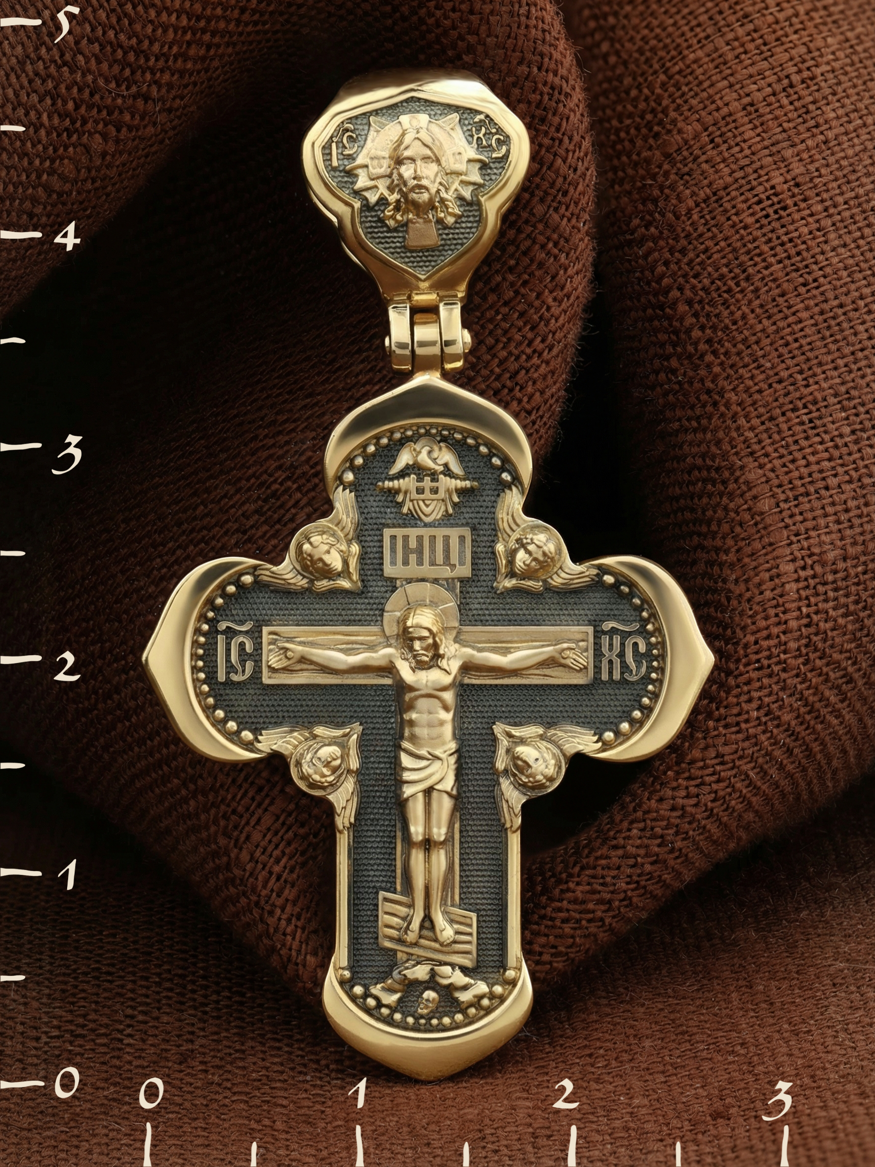 На лицевой стороне креста изображено Распятие Господа и Спасителя нашего Иисуса Христа, отдавшего Себя на смерть, для искупления грехов мира. Крест является символом жертвенной любви Всеблагого Бога к падшим людям, всепобеждающим духовным оружием христиан, основанием и средоточием церковной жизни. Господь сказал: «кто хочет идти за Мною, отвергнись себя, и возьми крест свой, и следуй за Мною». (Мк. 8: 34). На верхней табличке, выше головы Иисуса, расположена надпись, составленная Понтием Пилатом — «IНЦI». Она означает «Иисус Назорей, Царь Иудейский». Надпись «IC» «ХC», означает Иисус Христос, помещается на разных сторонах поперечной перекладины креста. Крест стоит на горе камней, символизирующих Голгофу. В ее основании различается череп– это голова Адама. На кулонном кольце изображен Нерукотворный образ Господа и Спасителя нашего Иисуса Христа, чудесно отпечатавшийся на плате, которым Христос вытер свой лик.