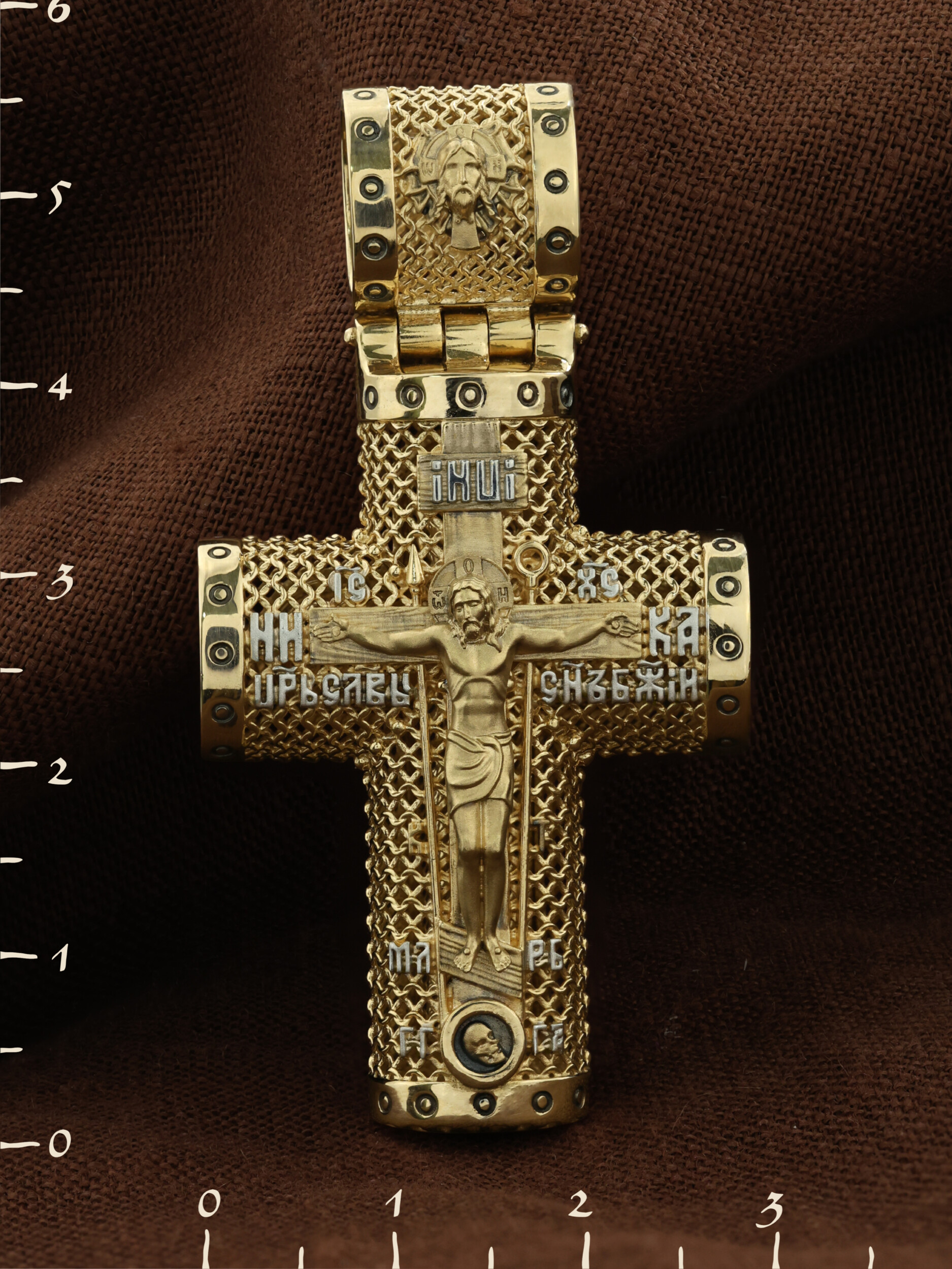 На лицевой стороне креста изображено Распятие Господа и Спасителя нашего Иисуса Христа. Крест- символ спасения и искупления рода человеческого, знамение победы над смертью и адом. Иисус Христос, как искупительная жертва освобождения человечества от власти греха, умер крестной смертью и в третий день воскрес. Распятие сопровождается каноническими надписями. На верхней табличке, выше головы Иисуса, расположена надпись, составленная Понтием Пилатом — «IНЦI». Она означает «Иисус Назорей, Царь Иудейский». Надписи «IC» «ХC», означает Иисус Христос, «НИКА», что означает Победитель, «Царь Славы» и «Сын Божий», размещается на разных сторонах поперечной перекладины креста. Крест стоит на горе камней, символизирующих Голгофу, которая обозначена надписью «Г Г». В ее основании различается череп — это голова Адама, обозначенный надписью «Г А». Надпись «МЛРБ» — «место лобное рай бысть» означает место лобное стало раем. Вдоль креста изображены орудия Страстей Христовых: копие сотника Лонгина, которым пронзили подреберье мёртвого Иисуса, чтобы убедиться в Его смерти, и трость с губкой, с которой Иисуса напоили уксусом. Они обозначены буквами «К» и «Т». На кулонном кольце размещен «Нерукотворный образ Иисуса Христа», на оборотной стороне кулонного кольца- шестикрылый Серафим.