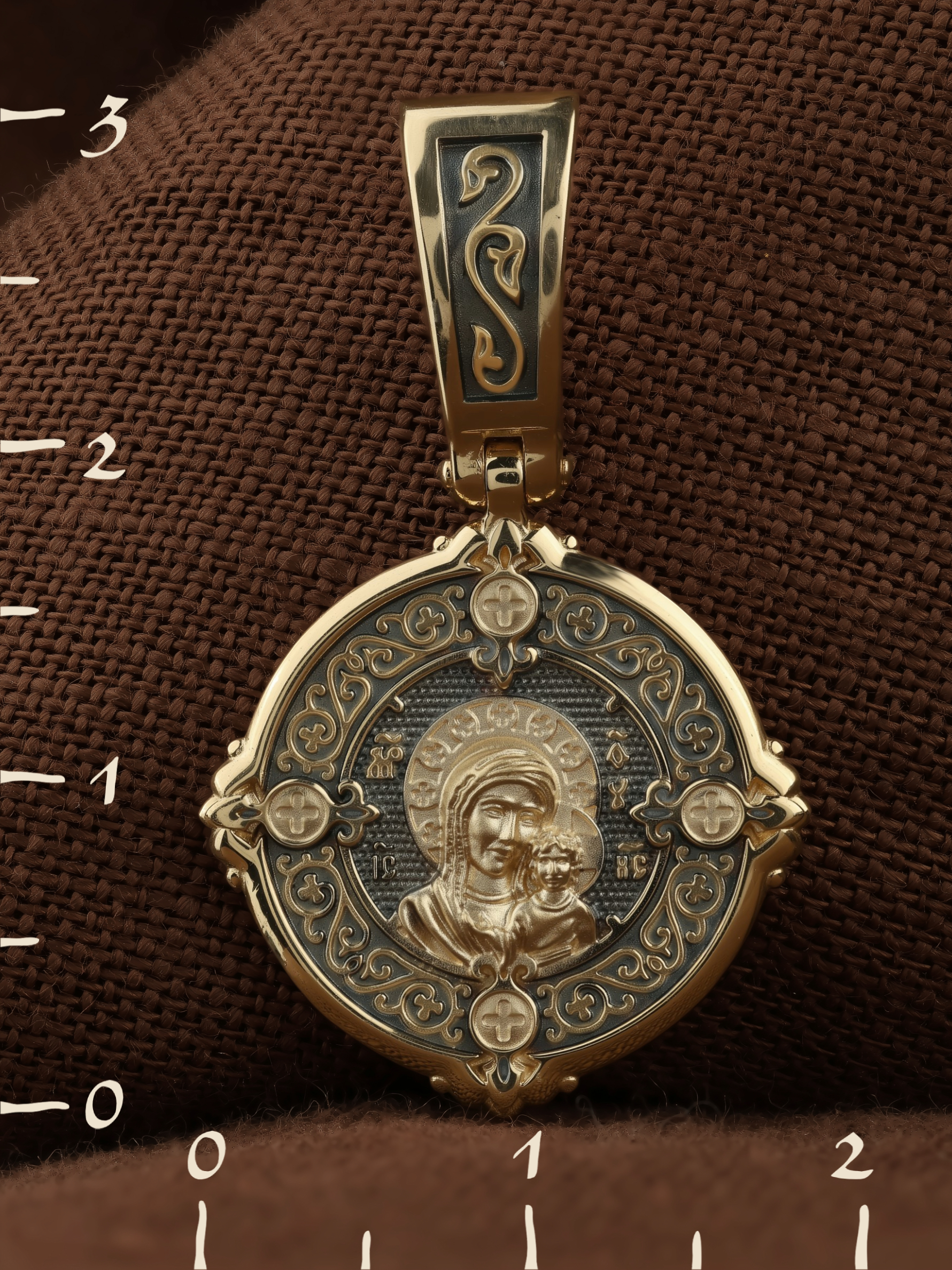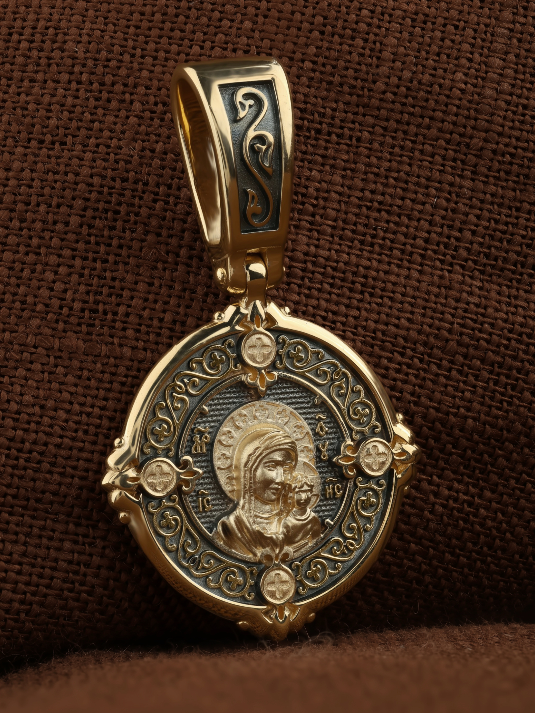 На лицевой части образка изображена Казанская икона Пресвятой Богородицы — одна из самых почитаемых в России чудотворных икон Богородицы. Богословское значение Казанской иконы — указать верующим истинный Путь к спасению, который лежит через Христа. Только Божия Матерь имеет настолько сильное дерзновение к Спасителю, что может ходатайствовать перед Ним за всех верных. Именно этот образ дарится новой повенчанной паре, как хранитель очага и семейная реликвия. Молитва перед Казанской иконой Божьей Матери помогает во всех сложных случаях жизни, в болезнях, во всех печалях, невзгодах, скорбях. Уникальная история появления, чудеса, случившиеся по молитвам православных людей возле образа — все это делает Казанскую Богородицу особенной, среди тысяч других икон.