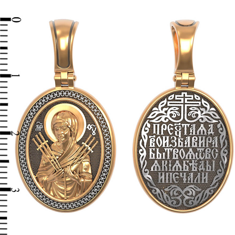 На лицевой стороне образка изображена икона Пресвятой Богородицы «Семистрельная» — одна из самых чудотворных икон на Руси. На протяжении многих веков христиане взывали к Царице Небесной через эту икону, если в стране начинались войны или мятежи.