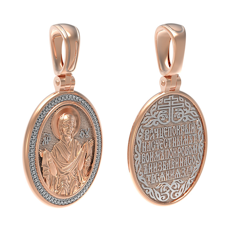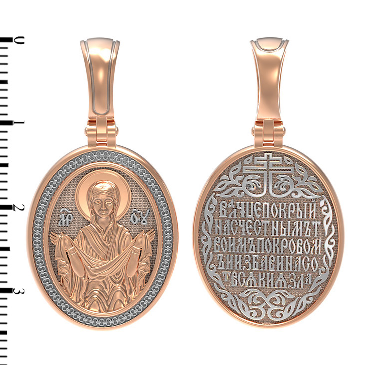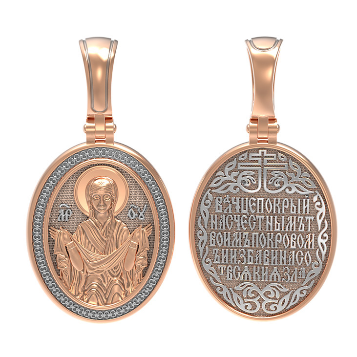 На лицевой части образка изображена икона Покров Пресвятой Богородицы. Праздник Покрова Божией Матери является воспоминанием чуда, которое произошло во Влахнернской церкви 1 (14) октября 910 года: Пресвятая Богородица явилась верующим над алтарем храма и распростерла над ними Свое покрывало. В этот день Божья Матерь открыла людям, что Она является Ходатаицей за них перед Богом. Богородица простирает Свой молитвенный покров над всеми православными христианами и умоляет Сына Своего о даровании вечного спасения каждому человеку.
