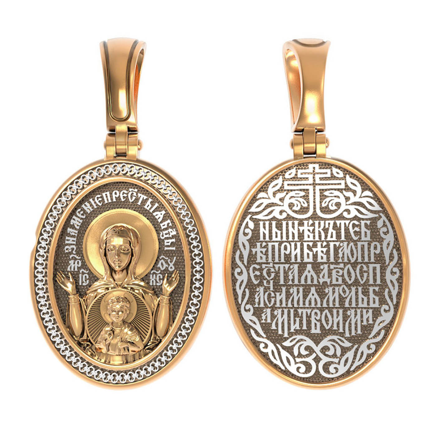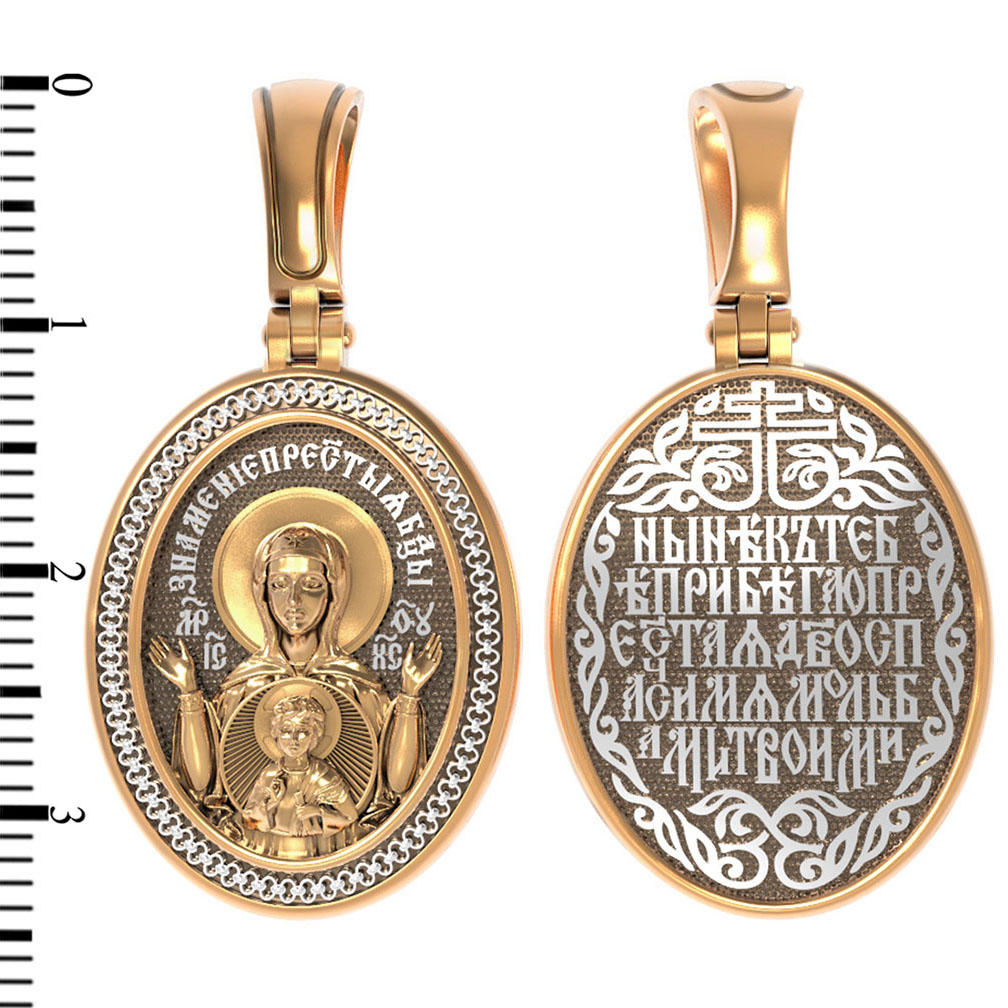 В центр образка помещен образ Божией Матери «Знамение», прославившийся многими чудесами в Новгороде в XII веке. Икона эта чтится как одна из самых великих святынь Русской земли. Молитвенно воздетые руки Богородицы означают заступничество за людей пред Богом. Рядом с Ней, на фоне круглого щита, — благословляющий Божественный Младенец — Спас-Эммануил.
