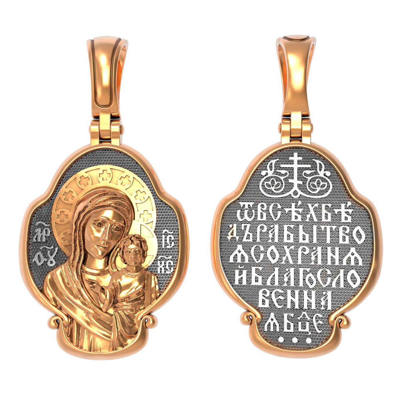 На лицевой части образка изображена Казанская икона Божией Матери — одна из самых почитаемых в России чудотворных икон Богородицы. Богословское значение Казанской иконы — указать верующим истинный Путь к спасению, который лежит через Христа. Только Божия Матерь имеет настолько сильное дерзновение к Спасителю, что может ходатайствовать перед Ним за всех верных. Именно этот образ дарится новой повенчанной паре, как хранитель очага и семейная реликвия. Молитва перед Казанской иконой Божьей Матери помогает во всех сложных случаях жизни, в болезнях, во всех печалях, невзгодах, скорбях. Уникальная история появления, чудеса, случившиеся по молитвам православных людей возле образа — все это делает Казанскую Богородицу особенной, среди тысяч других икон.