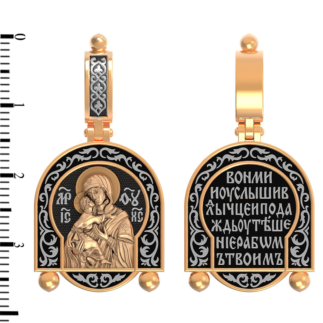 Лицевую сторону возглавляет Владимирская икона Божией Матери — самая Великая русская Святыня, многие века бывшая олицетворением нашей земли. Перед ней венчались на царство государи, избирались патриархи. Пречистой Богородице Владимирской клялись в верности Отечеству солдаты и за нее умирали на поле брани. Именно на ее защиту более всего уповала Россия в самые страшные периоды своей истории. Владимирская икона Божией Матери, по преданию, была написана на доске трапезного стола из дома Иисуса Христа. На Русь она была привезена в начале XII века и с тех пор почитается как главная святыня нашего Отечества. Перед ней молитвенно просят Богородицу об исцелении от телесных недугов, в частности, заболеваний сердца и сердечнососудистой системы. За помощью к ней обращаются во время бедствий, когда нуждаются в защите от врагов.