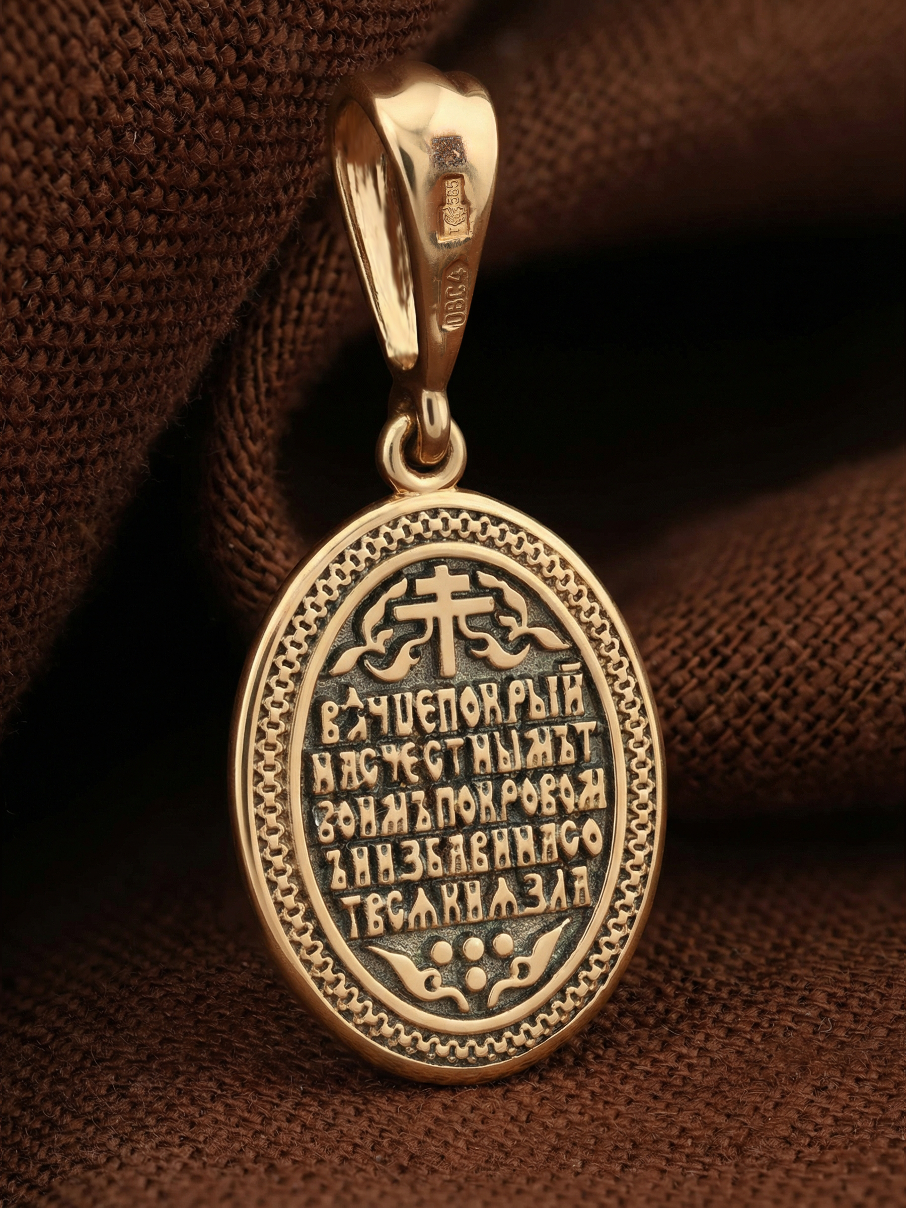 На лицевой части образка изображена икона Покров Пресвятой Богородицы. Праздник Покрова Божией Матери является воспоминанием чуда, которое произошло во Влахнернской церкви 1 (14) октября 910 года: Пресвятая Богородица явилась верующим над алтарем храма и распростерла над ними Свое покрывало. В этот день Божья Матерь открыла людям, что Она является Ходатаицей за них перед Богом. Богородица простирает Свой молитвенный покров над всеми православными христианами и умоляет Сына Своего о даровании вечного спасения каждому человеку.