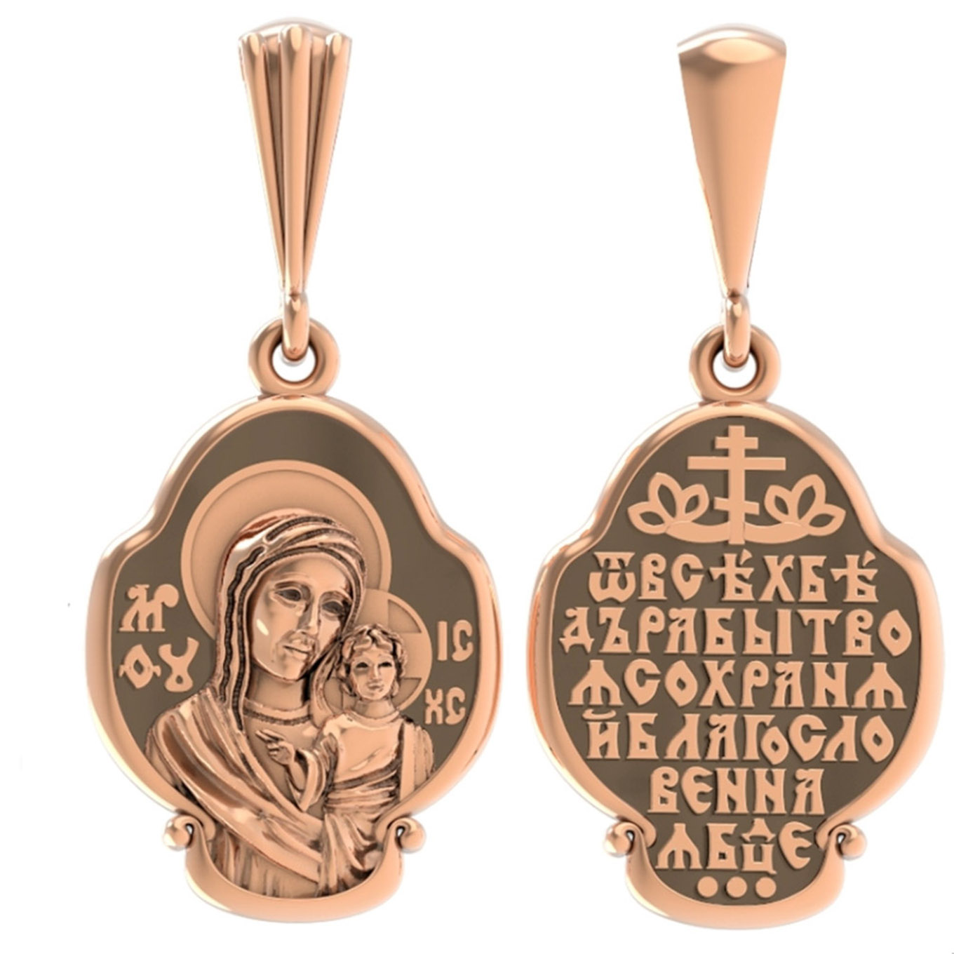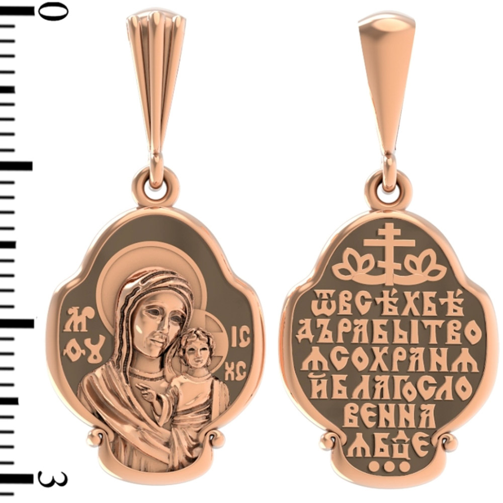 На лицевой части образка изображена Казанская икона Божией Матери — одна из самых почитаемых в России чудотворных икон Богородицы. Богословское значение Казанской иконы — указать верующим истинный Путь к спасению, который лежит через Христа. Только Божия Матерь имеет настолько сильное дерзновение к Спасителю, что может ходатайствовать перед Ним за всех верных. Именно этот образ дарится новой повенчанной паре, как хранитель очага и семейная реликвия. Молитва перед Казанской иконой Божьей Матери помогает во всех сложных случаях жизни, в болезнях, во всех печалях, невзгодах, скорбях. Уникальная история появления, чудеса, случившиеся по молитвам православных людей возле образа — все это делает Казанскую Богородицу особенной, среди тысяч других икон.