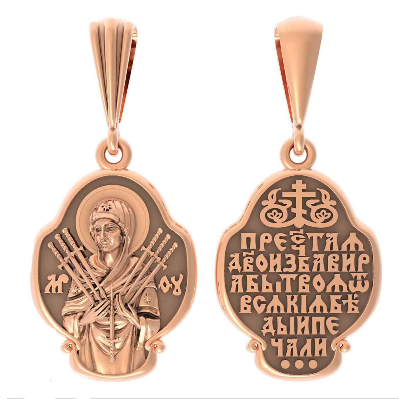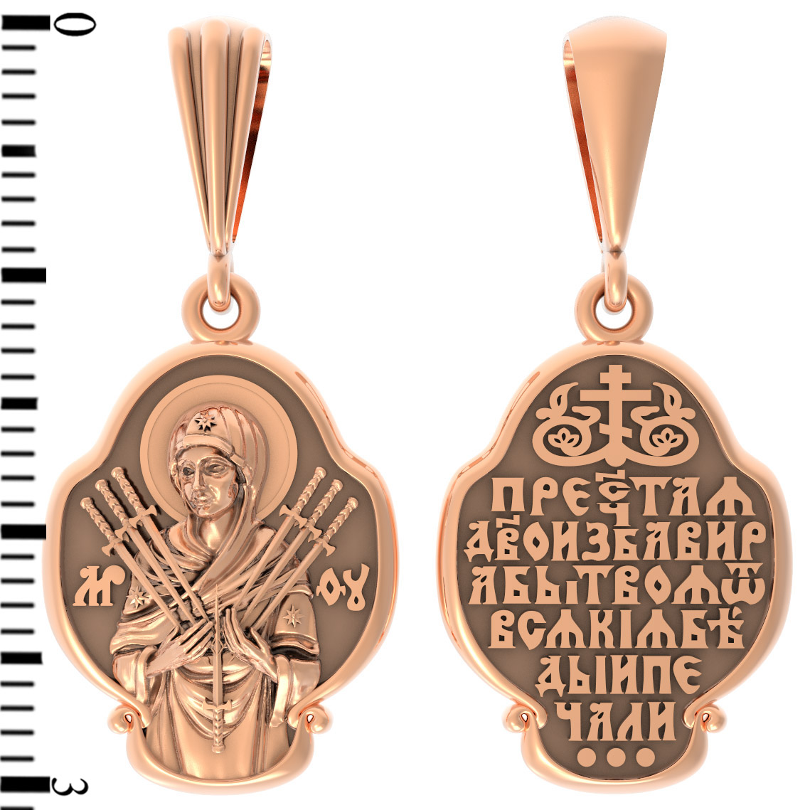 На лицевой стороне образка изображена икона Пресвятой Богородицы «Семистрельная» — одна из самых чудотворных икон на Руси. На протяжении многих веков христиане взывали к Царице Небесной через эту икону, если в стране начинались войны или мятежи.