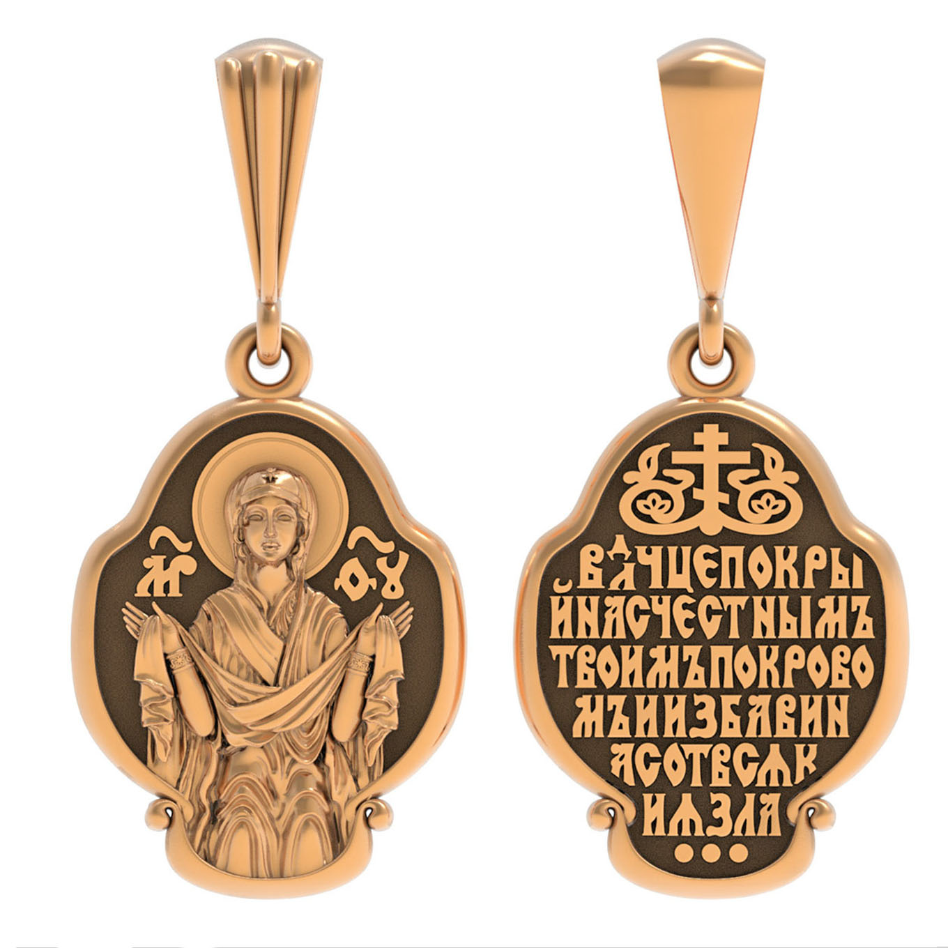 На лицевой части образка изображена икона Покров Пресвятой Богородицы. Праздник Покрова Божией Матери является воспоминанием чуда, которое произошло во Влахнернской церкви 1 (14) октября 910 года: Пресвятая Богородица явилась верующим над алтарем храма и распростерла над ними Свое покрывало. В этот день Божья Матерь открыла людям, что Она является Ходатаицей за них перед Богом. Богородица простирает Свой молитвенный покров над всеми православными христианами и умоляет Сына Своего о даровании вечного спасения каждому человеку.