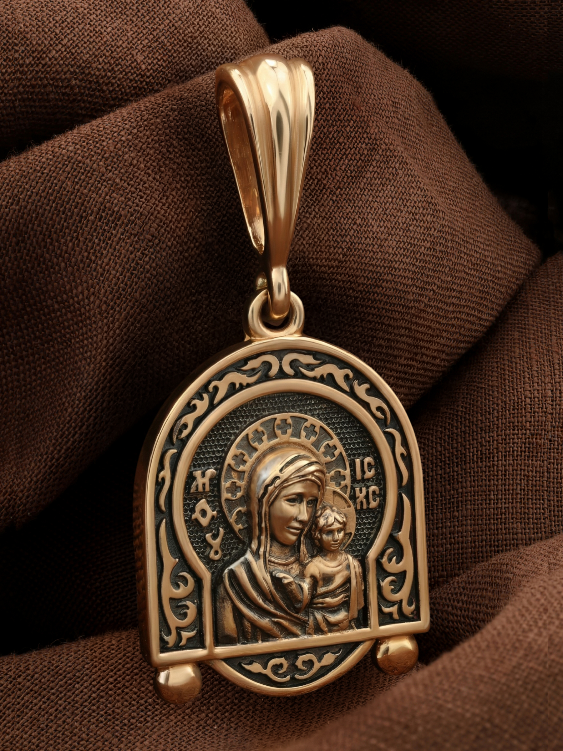 На лицевой части образка изображена Казанская икона Божией Матери — одна из самых почитаемых в России чудотворных икон Богородицы. Богословское значение Казанской иконы — указать верующим истинный Путь к спасению, который лежит через Христа. Только Божия Матерь имеет настолько сильное дерзновение к Спасителю, что может ходатайствовать перед Ним за всех верных. Именно этот образ дарится новой повенчанной паре, как хранитель очага и семейная реликвия. Молитва перед Казанской иконой Божьей Матери помогает во всех сложных случаях жизни, в болезнях, во всех печалях, невзгодах, скорбях. Уникальная история появления, чудеса, случившиеся по молитвам православных людей возле образа — все это делает Казанскую Богородицу особенной, среди тысяч других икон.