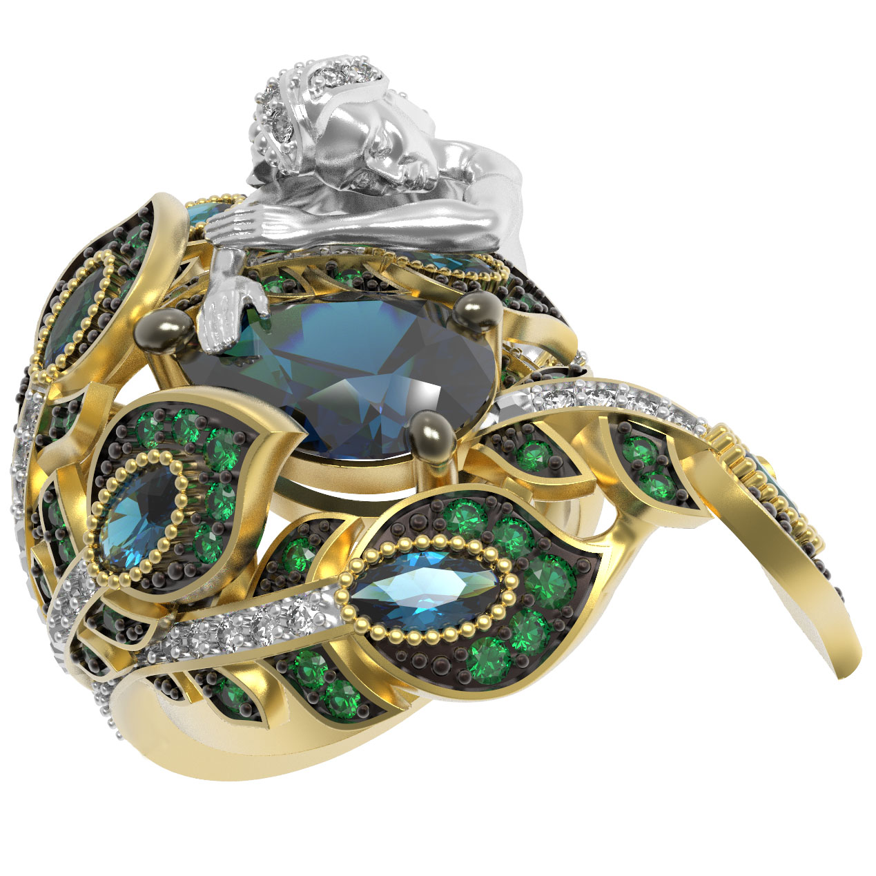 В центре композиции гармонично сочетаются топаз London blue и топаз London, чьи глубокие голубые и зеленоватые оттенки напоминают о тайнах древних легенд. Разнообразие форм вставок — груша, овал и круг — придает украшению динамику и глубину. Россыпь из 153 фианитов деликатно обрамляет основные камни, создавая притягательное сияние при каждом движении. Внешний вид кольца напоминает изящный скульптурный элемент, который эффектно выделяется на руке.