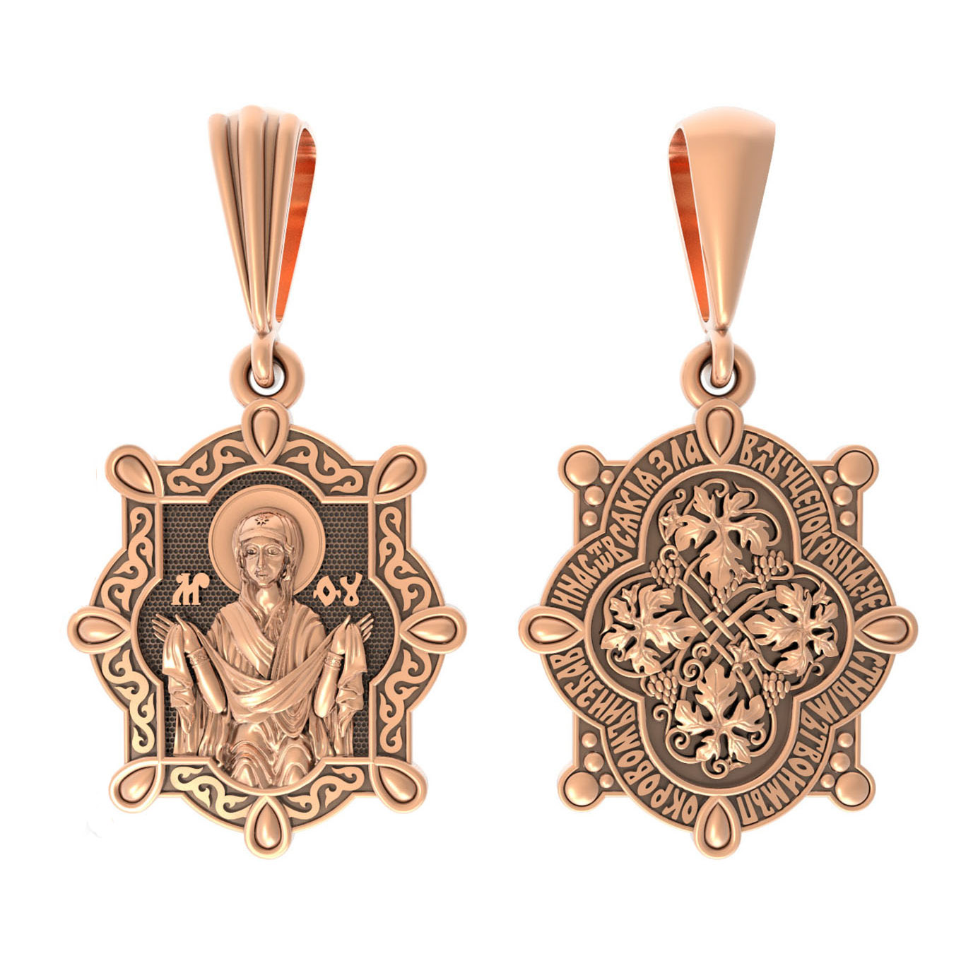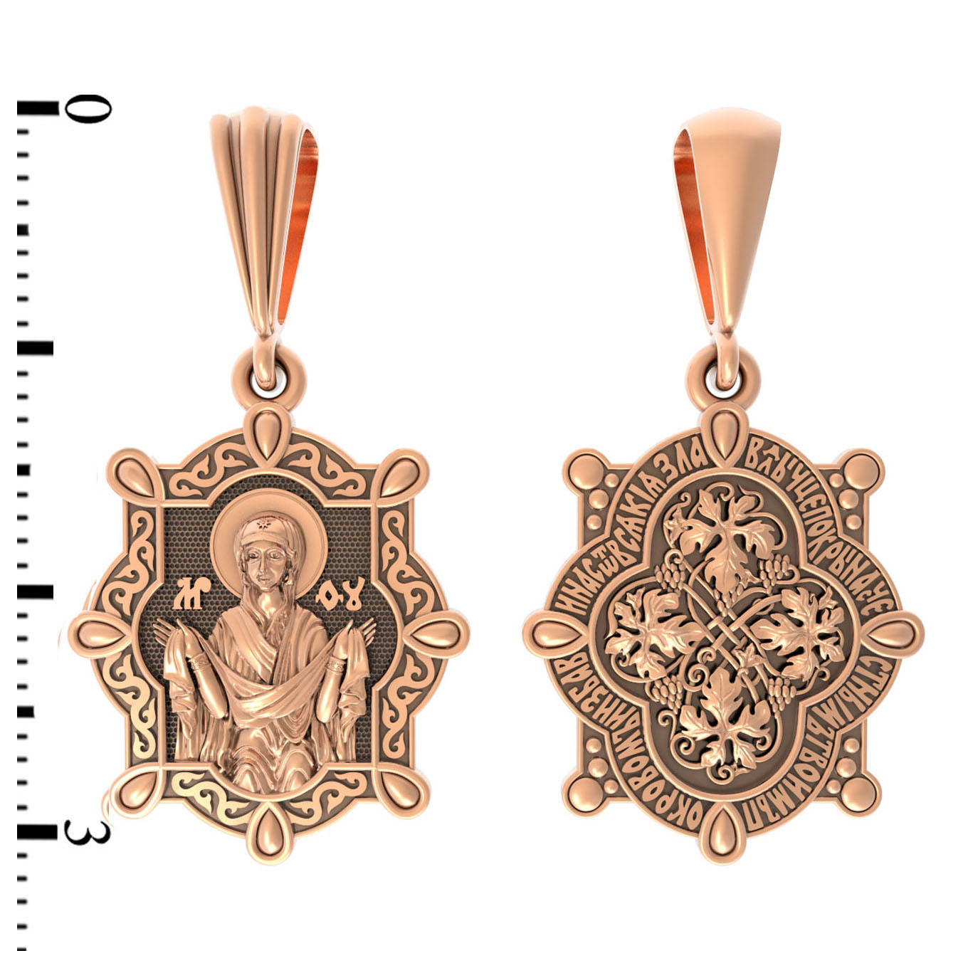 На лицевой части образка изображена икона Покров Пресвятой Богородицы. Праздник Покрова Божией Матери является воспоминанием чуда, которое произошло во Влахнернской церкви 1 (14) октября 910 года: Пресвятая Богородица явилась верующим над алтарем храма и распростерла над ними Свое покрывало. В этот день Божья Матерь открыла людям, что Она является Ходатаицей за них перед Богом. Богородица простирает Свой молитвенный покров над всеми православными христианами и умоляет Сына Своего о даровании вечного спасения каждому человеку.