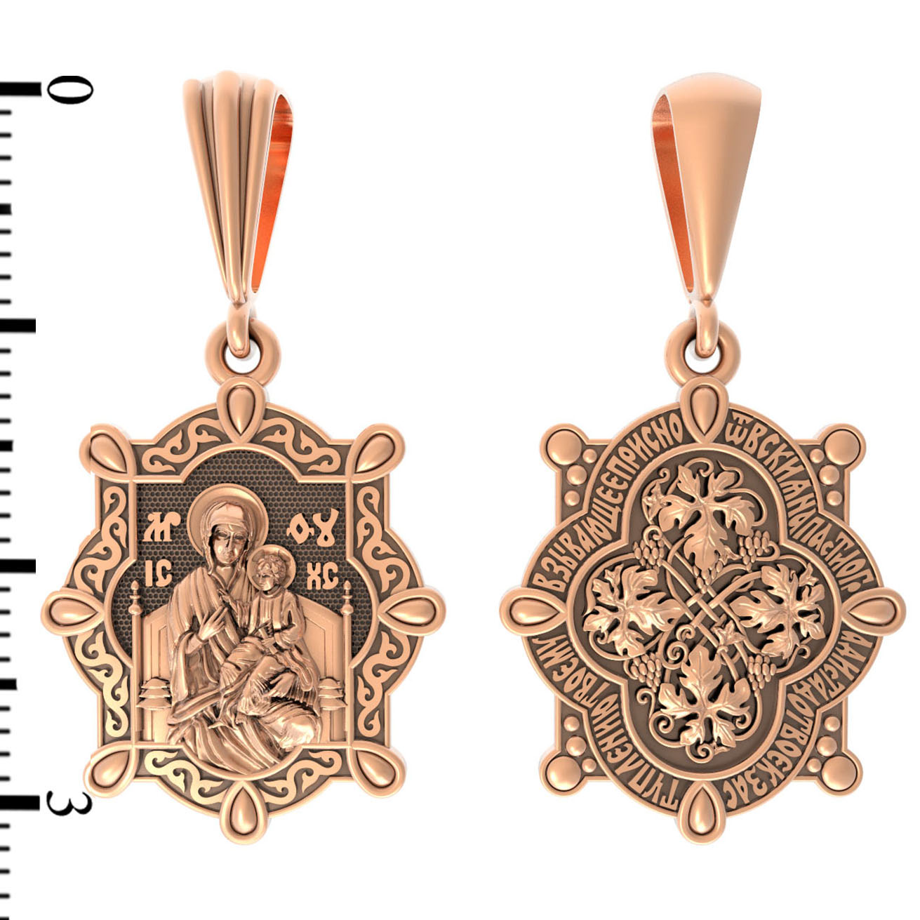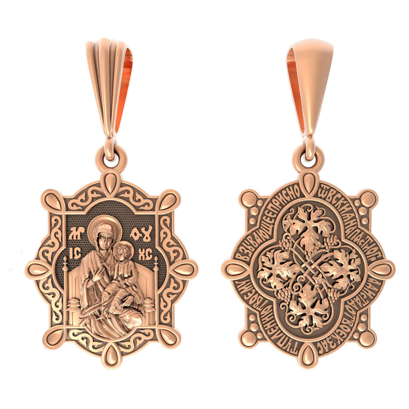 На оборотной стороне изображена виноградная лоза — символы церкви и евхаристии. «Я есмь лоза, — говорил Иисус Христос Своим ученикам, — а вы ветви; кто пребывает во Мне, и Я в нем, тот приносит много плода» (Ин. 15, 5), «Я есмь истинная виноградная лоза, а Отец Мой — виноградарь». Вокруг образка написана молитва Богородице в честь Ее иконы «Всецарица» (Пантанасса): «От всякия напасти огради стадо Твое, к заступлению Твоему взывающее присно».