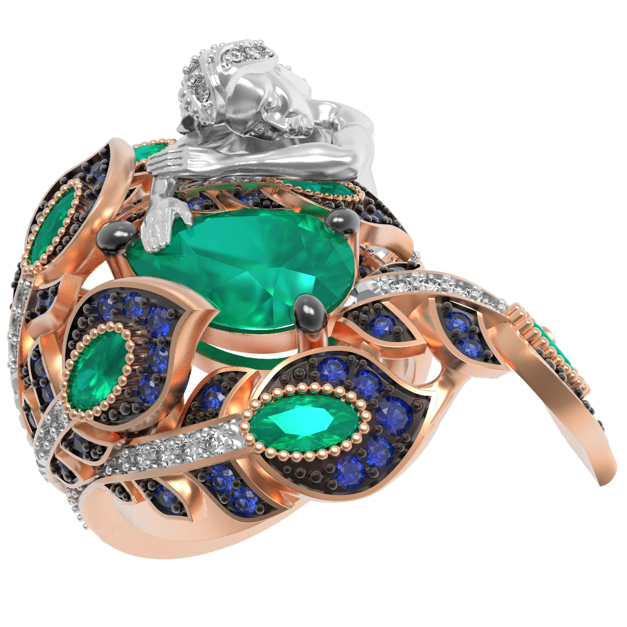 Изделие выполнено в теплом оттенке красного золота, который гармонично контрастирует с глубокими бирюзовыми и синими тонами вставок из фианита и хризопраза. Детализированная отделка придает кольцу особый шарм, превращая его в настоящий артефакт. Это украшение создано для тех, кто ценит художественный подход в ювелирном деле и предпочитает эксклюзивные аксессуары.