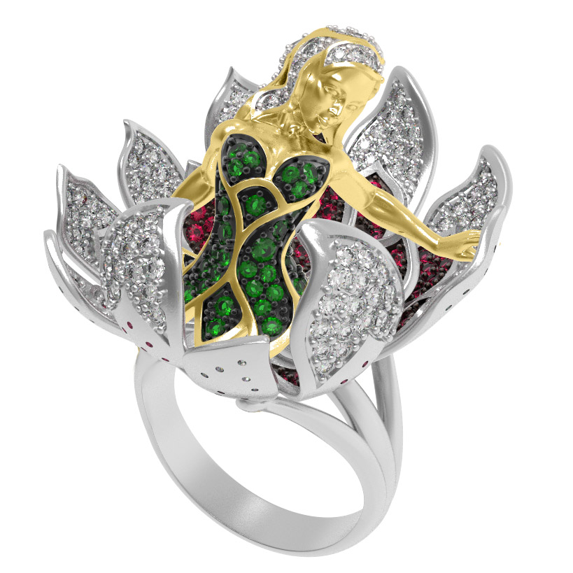 Кольцо из белого золота 585 пробы из коллекции De Luxe — Мифология — это воплощение художественного мастерства и глубокого символизма. Дизайн изделия вдохновлен темой мифологии, создавая уникальный образ, который приковывает взгляд своей детализацией и сложностью исполнения. В центре композиции расположена изящная фигура, напоминающая мифическую героиню, словно расцветающую из роскошного бутона.