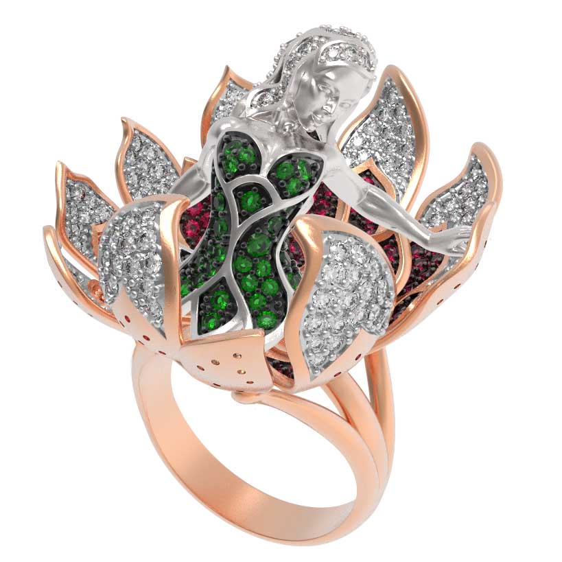 Кольцо из золота с фианитом — воплощение высокого ювелирного искусства, вдохновленное таинственными образами мифологии. Это украшение из коллекции De Luxe — Мифология станет центральным элементом вашего образа, привлекая восхищенные взгляды своей детализацией и художественным исполнением. Мастерская работа в красном золоте 585 пробы создает гармоничную основу для сложного дизайна, который напоминает распускающийся цветок с изящной фигурой в сердце композиции.