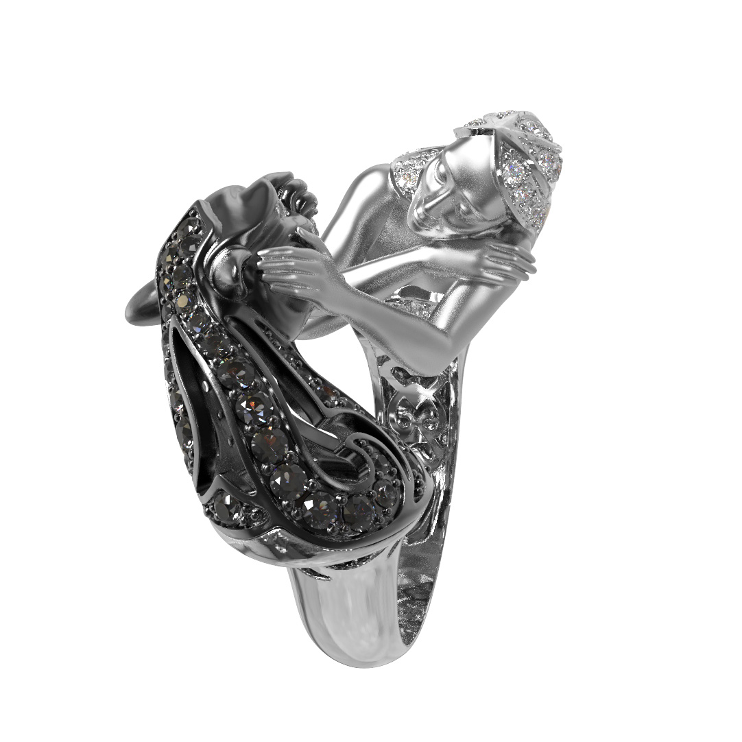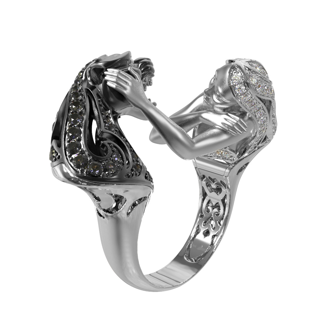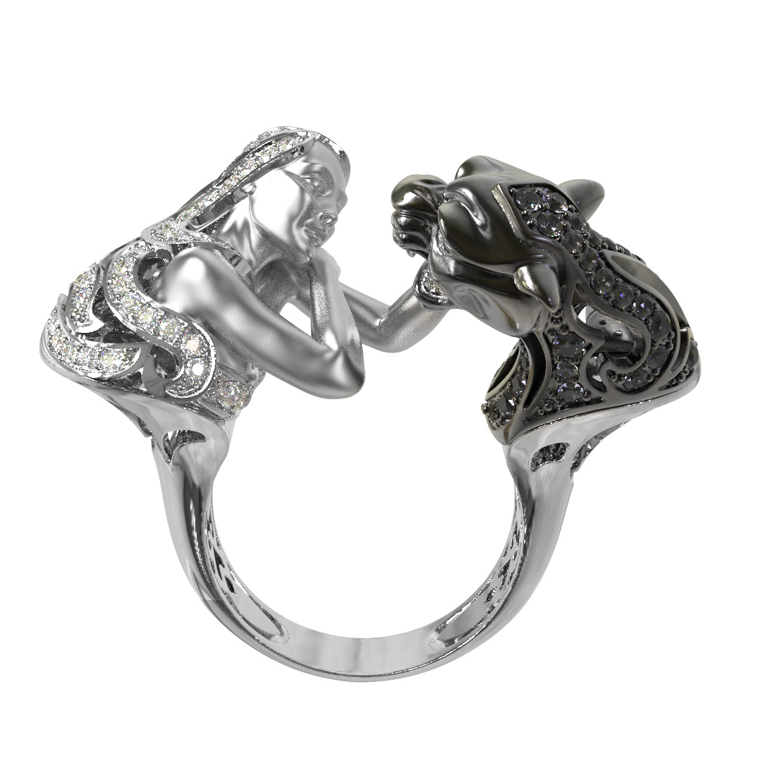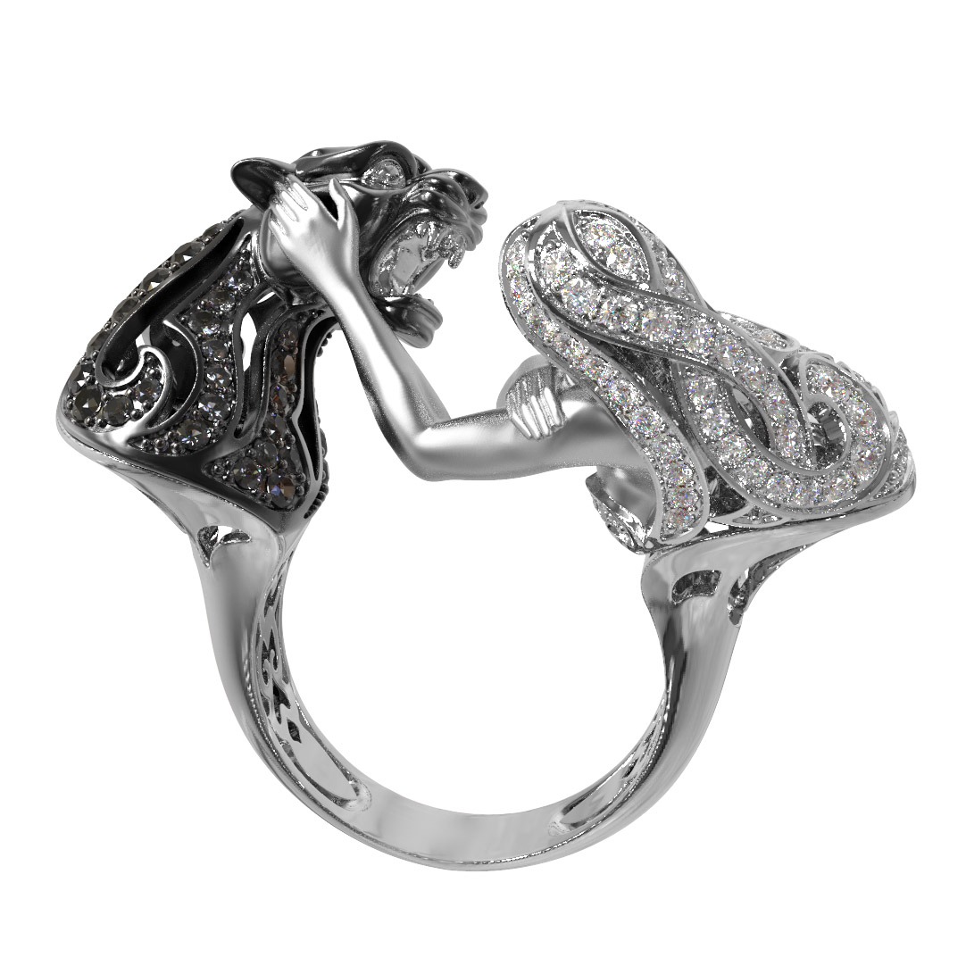 Особую выразительность кольцу придает инкрустация 116 фианитами круглой формы. Контрастное сочетание вставок черного цвета в деталях, стилизованных под хищника, и сверкающих прозрачных камней, украшающих женскую фигуру, создает эффектную игру света и тени. Массивная, но утонченная форма делает это кольцо универсальным украшением, которое подходит как для женщин, так и для мужчин, предпочитающих смелые и концептуальные аксессуары.