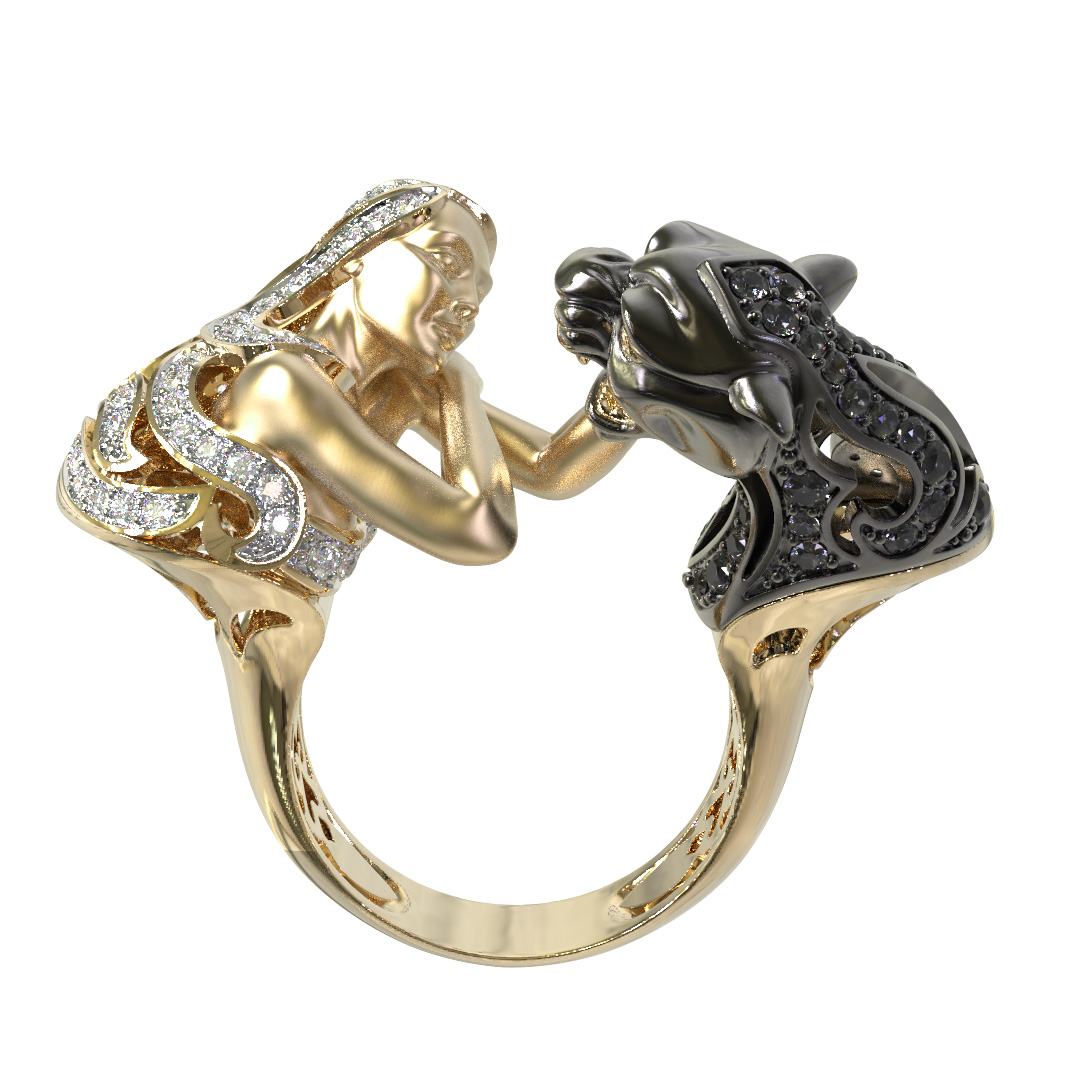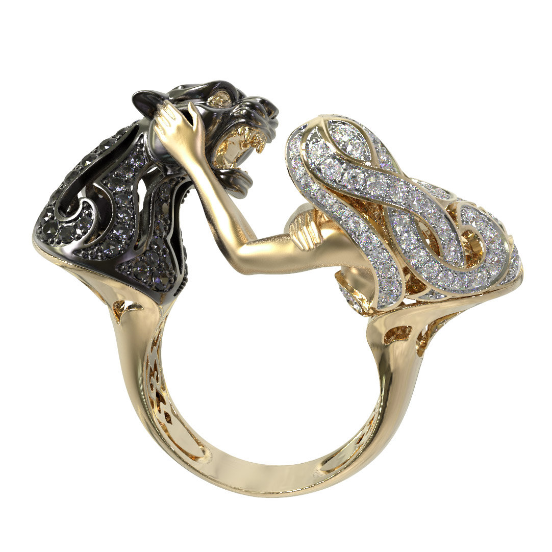 Особую выразительность модели придают 116 вставок из фианитов круглой формы. Контрастное сочетание черного цвета вставок и сияющего металла создает динамичный и глубокий образ, который притягивает взгляд. Ювелиры тщательно проработали каждую линию, чтобы подчеркнуть детализированный дизайн кольца.