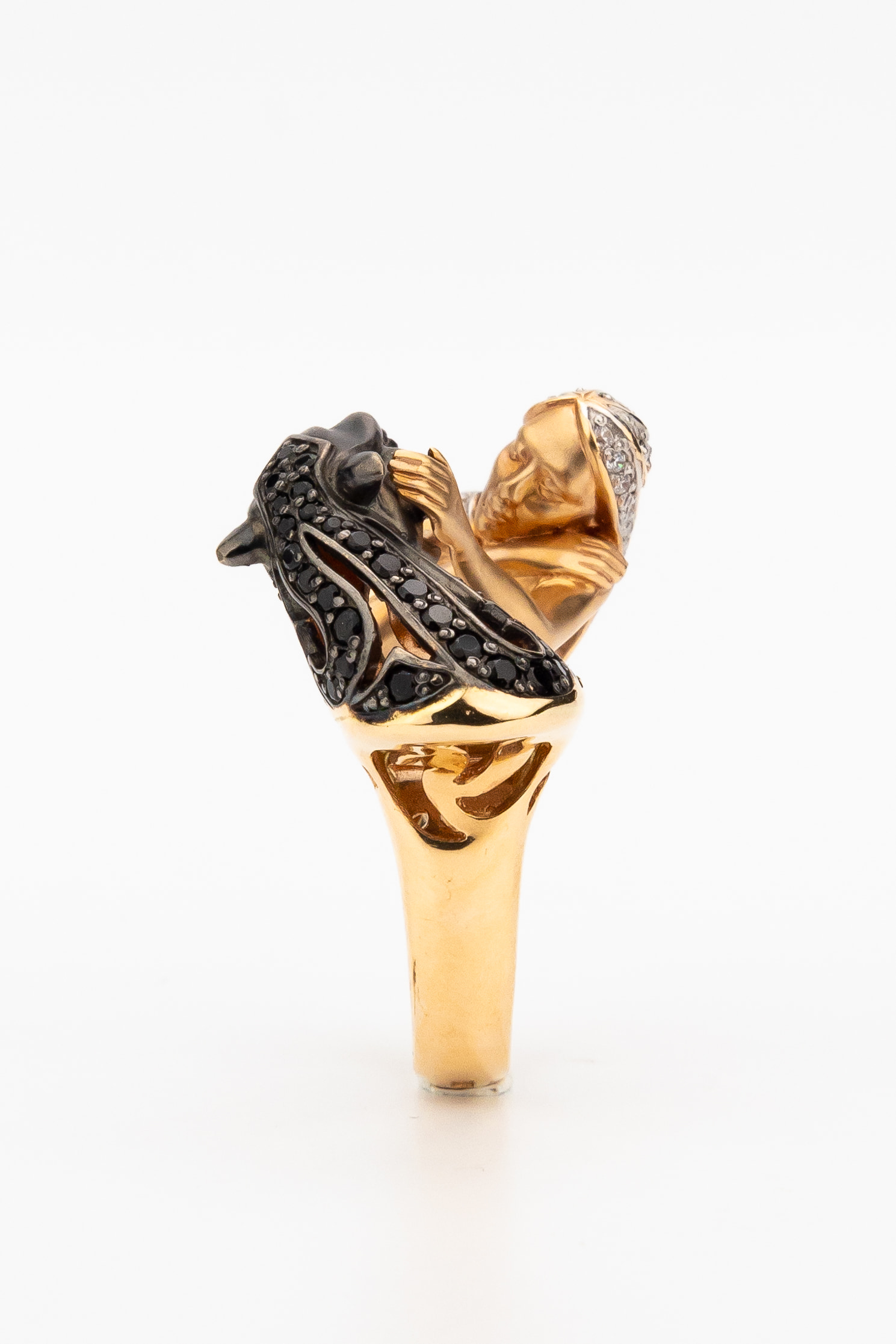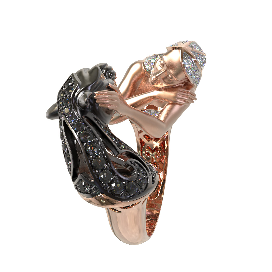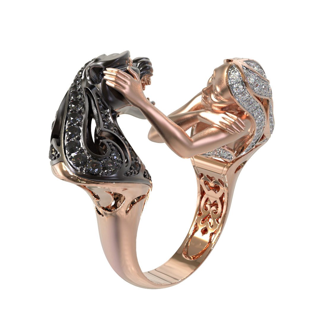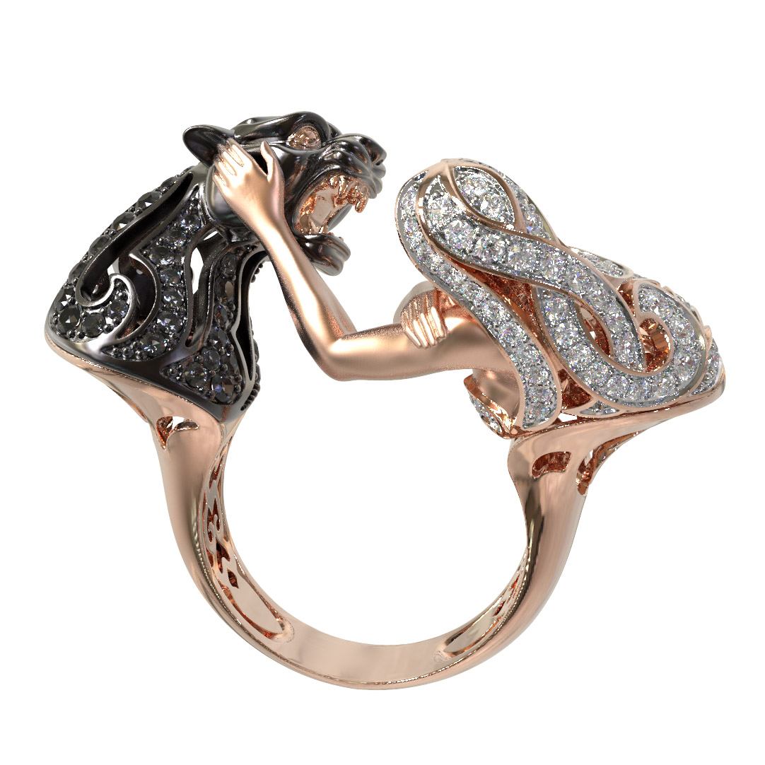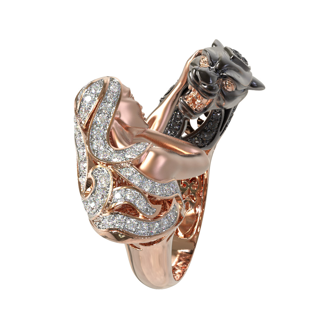 Визуальный акцент модели смещен на искусную инкрустацию. В отделке использовано 116 фианитов круглой формы, обладающих глубоким черным цветом вставок. Контраст между насыщенным красным золотом и блеском черных камней подчеркивает детализацию мифологического сюжета. Это кольцо одинаково гармонично дополнит образ как для женщин, так и для мужчин, подчеркивая индивидуальность владельца.