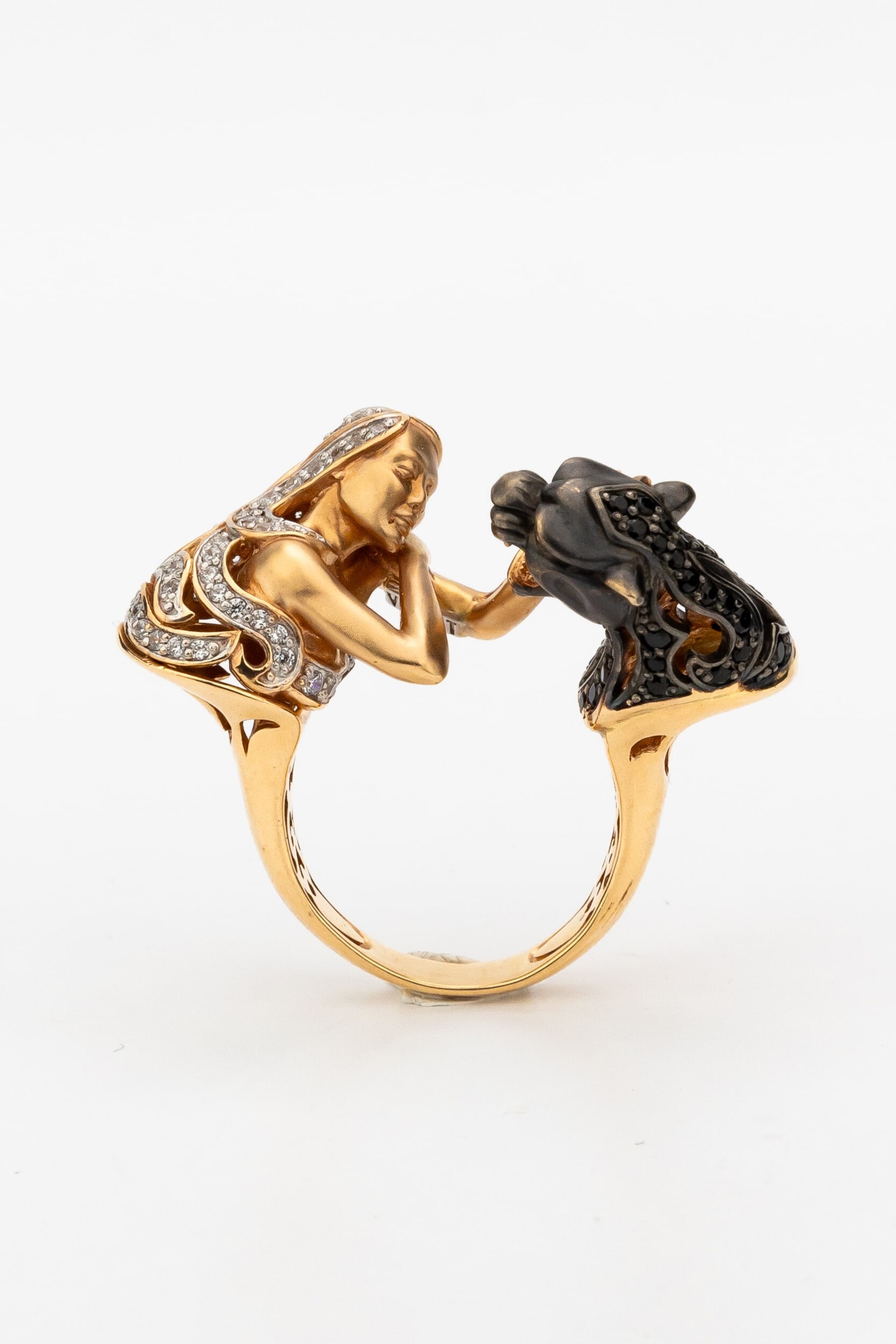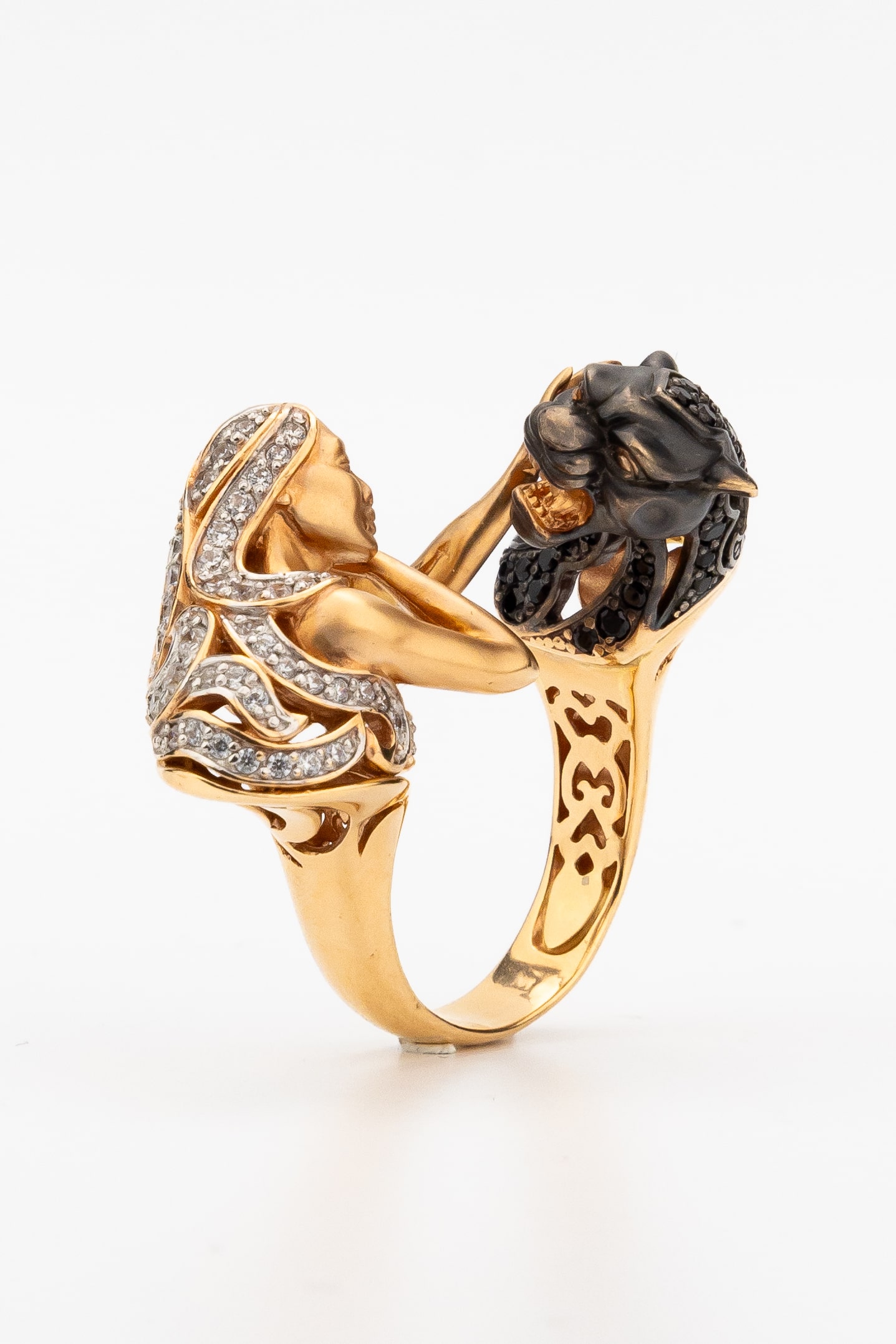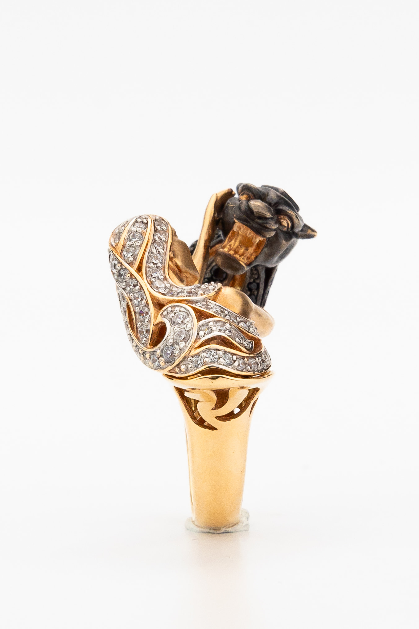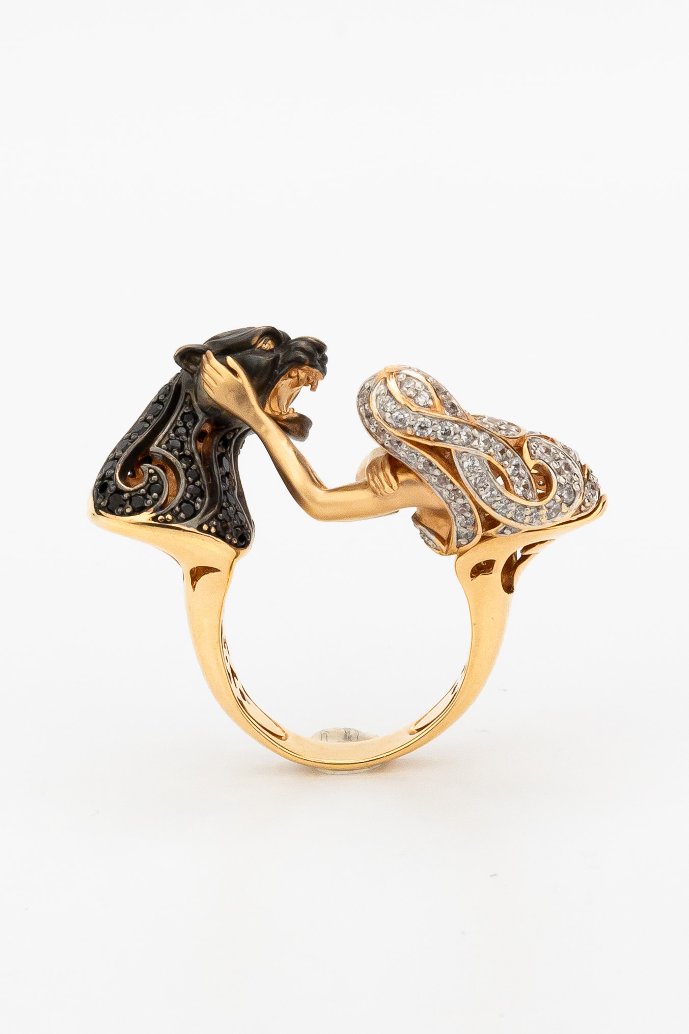 Визуальный акцент модели смещен на искусную инкрустацию. В отделке использовано 116 фианитов круглой формы, обладающих глубоким черным цветом вставок. Контраст между насыщенным красным золотом и блеском черных камней подчеркивает детализацию мифологического сюжета. Это кольцо одинаково гармонично дополнит образ как для женщин, так и для мужчин, подчеркивая индивидуальность владельца.