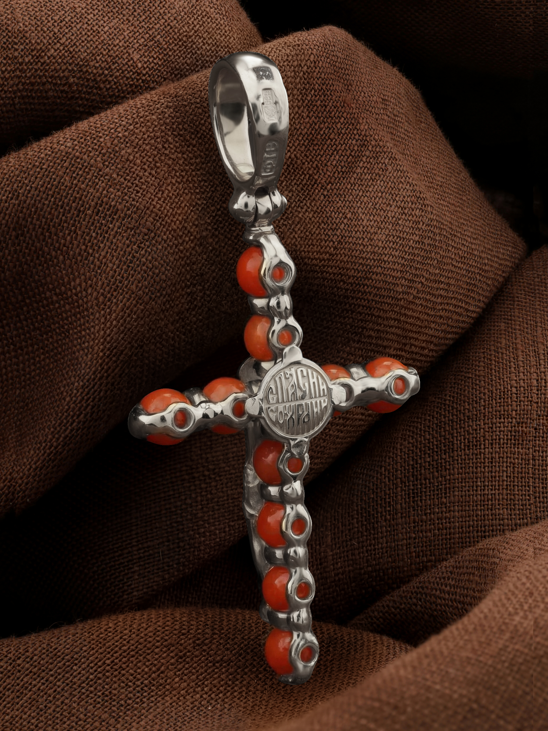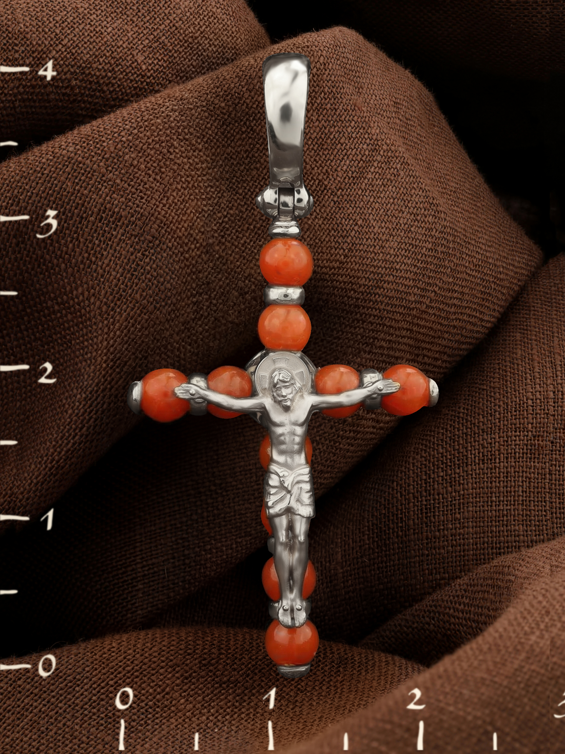 Крест из белого золота c кораллом