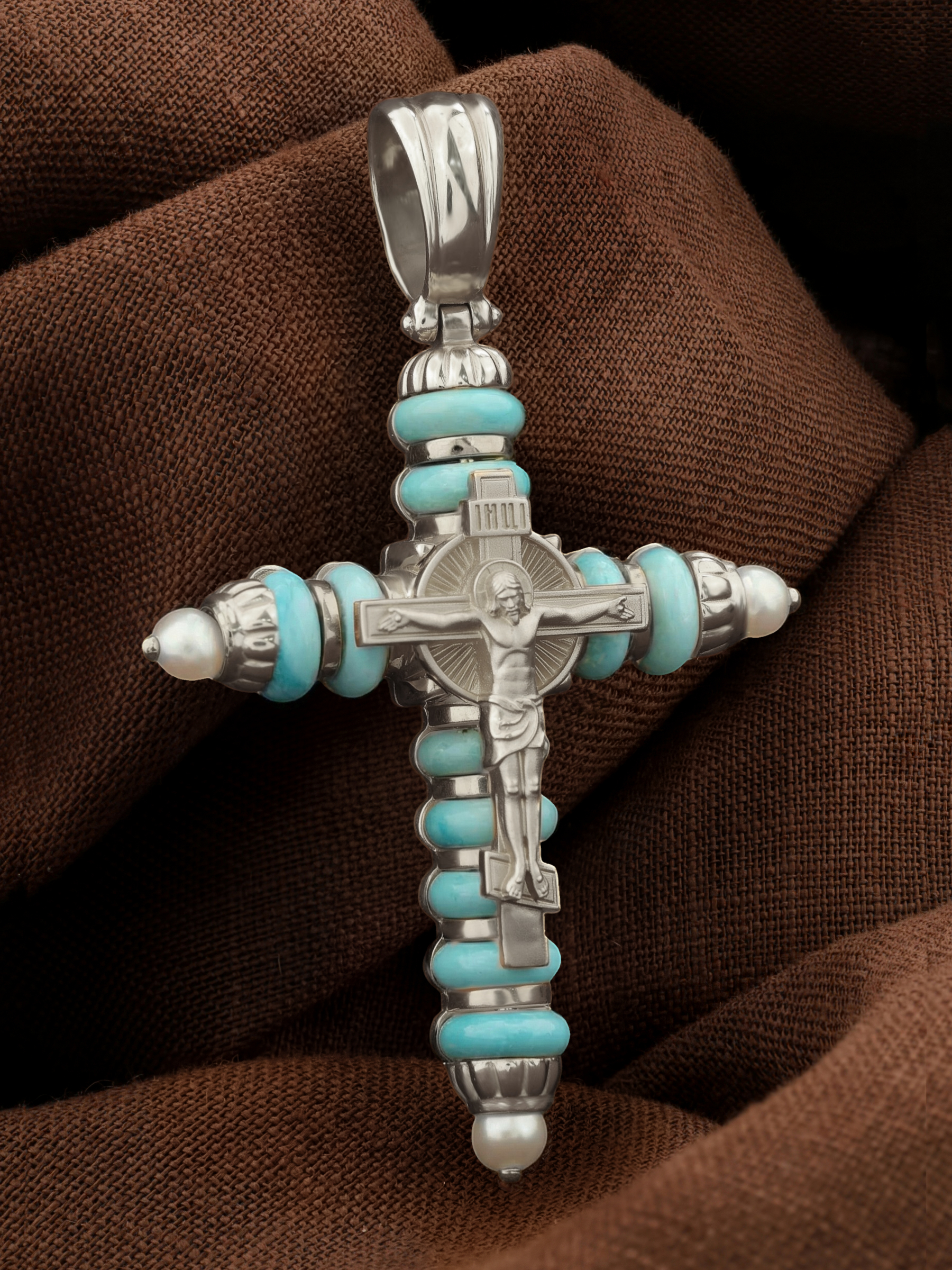 Крест из белого золота c жемчугом и бирюзой