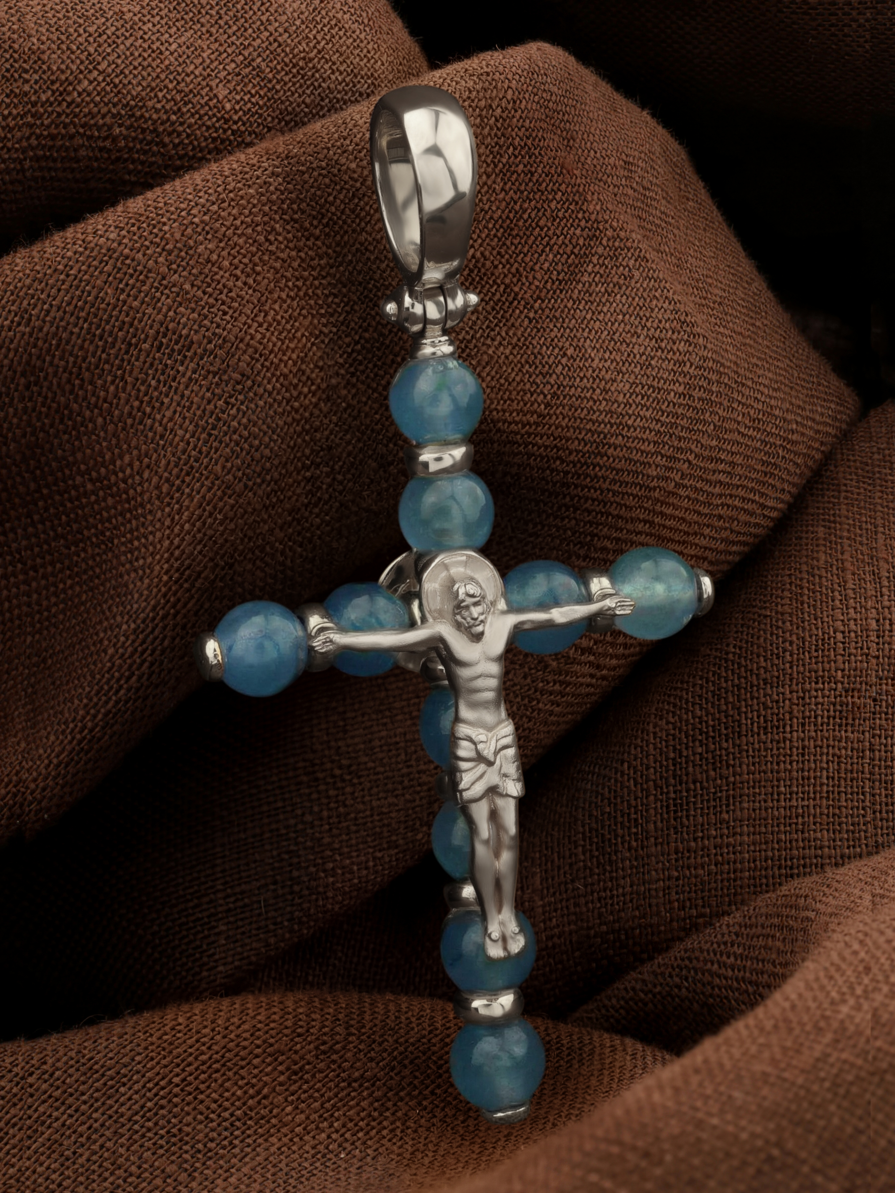 На лицевой стороне креста изображено Распятие Господа и Спасителя нашего Иисуса Христа. Своими крестными страданиями Господь смыл наши грехи, покрыл наш долг перед Богом или, на языке Писания, нас «искупил». В Голгофе сокрыта непостижимая тайна бесконечной правды и любви Бога. Крест стал символом победы добра над злом, жизни над смертью, напоминанием бесконечной Божьей любви, предметом радости. Воплотившийся Сын Божий Своею кровью освятил крест и сделал его проводником Своей благодати, источником освящения верующих. На верхней табличке, выше головы Иисуса, расположена надпись, составленная Понтием Пилатом — «IНЦI». Она означает «Иисус Назорей, Царь Иудейский». Надпись «IC» «ХC», означает Иисус Христос, помещаются на разных сторонах поперечной перекладины креста. Христос в Своей Божественной любви, над которой смерть не властна и которая, страдая, и не страдает в обычном смысле, простирает к людям со Креста Свои объятия, в которые призывается и привлекается весь мир. Поэтому Тело Его не висит, а торжественно покоится на Кресте.