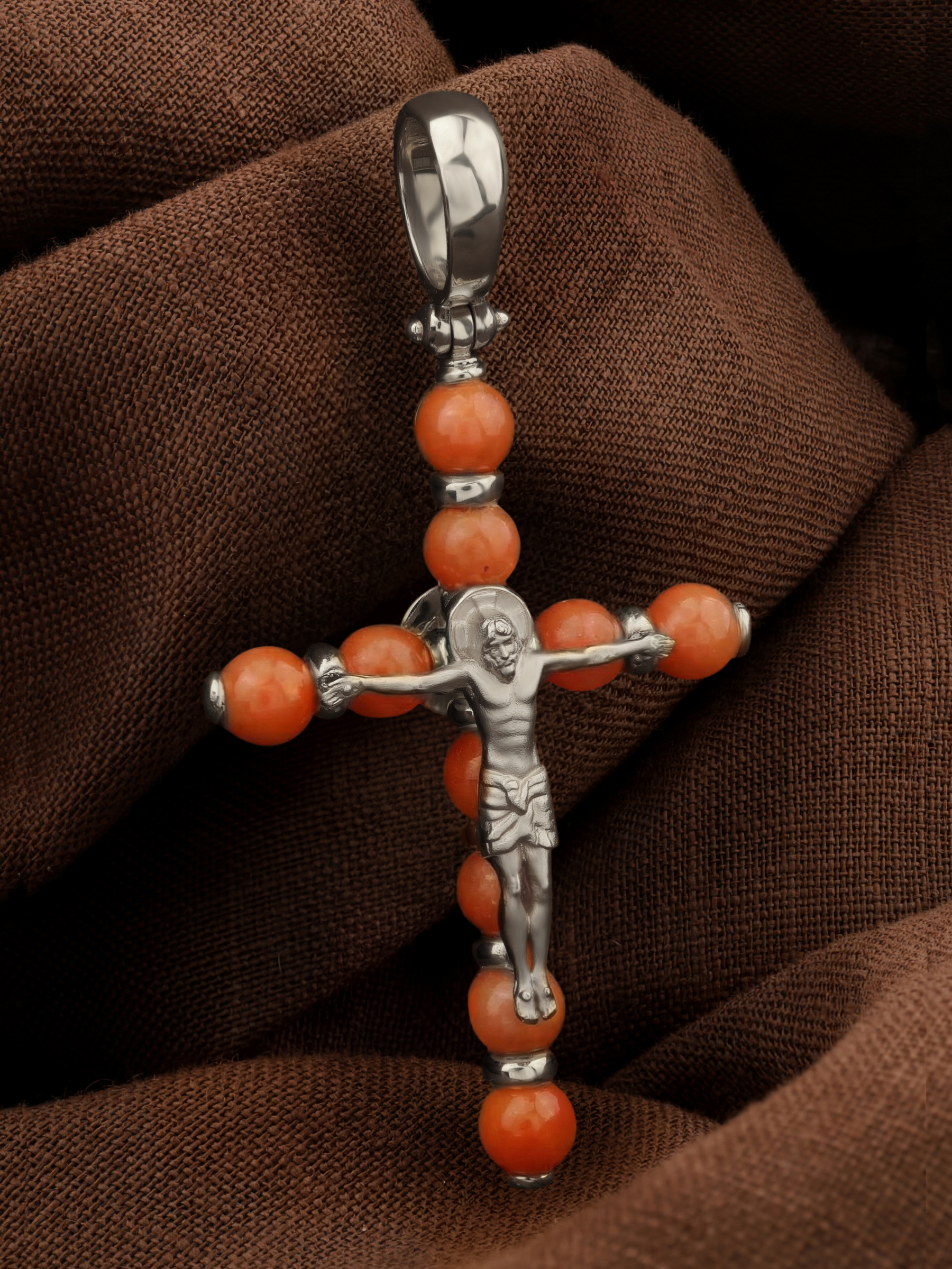 На лицевой стороне креста изображено Распятие Господа и Спасителя нашего Иисуса Христа. Своими крестными страданиями Господь смыл наши грехи, покрыл наш долг перед Богом или, на языке Писания, нас «искупил». В Голгофе сокрыта непостижимая тайна бесконечной правды и любви Бога. Крест стал символом победы добра над злом, жизни над смертью, напоминанием бесконечной Божьей любви, предметом радости. Воплотившийся Сын Божий Своею кровью освятил крест и сделал его проводником Своей благодати, источником освящения верующих. На верхней табличке, выше головы Иисуса, расположена надпись, составленная Понтием Пилатом — «IНЦI». Она означает «Иисус Назорей, Царь Иудейский». Надпись «IC» «ХC», означает Иисус Христос, помещаются на разных сторонах поперечной перекладины креста. Христос в Своей Божественной любви, над которой смерть не властна и которая, страдая, и не страдает в обычном смысле, простирает к людям со Креста Свои объятия, в которые призывается и привлекается весь мир. Поэтому Тело Его не висит, а торжественно покоится на Кресте.