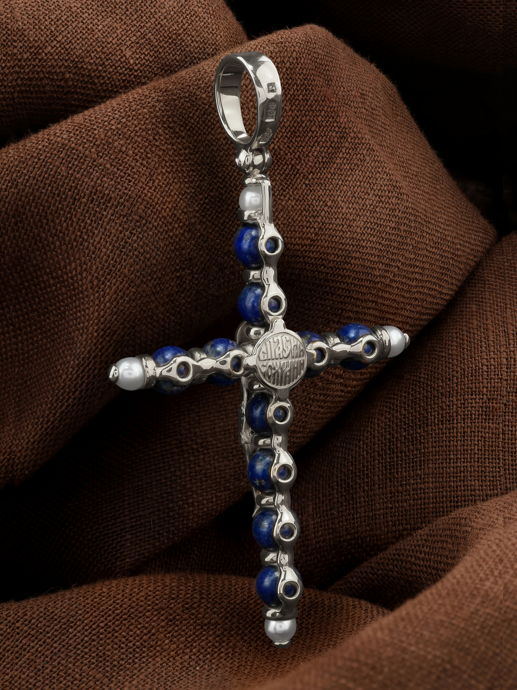 Крест из белого золота c жемчугом и лазуритом