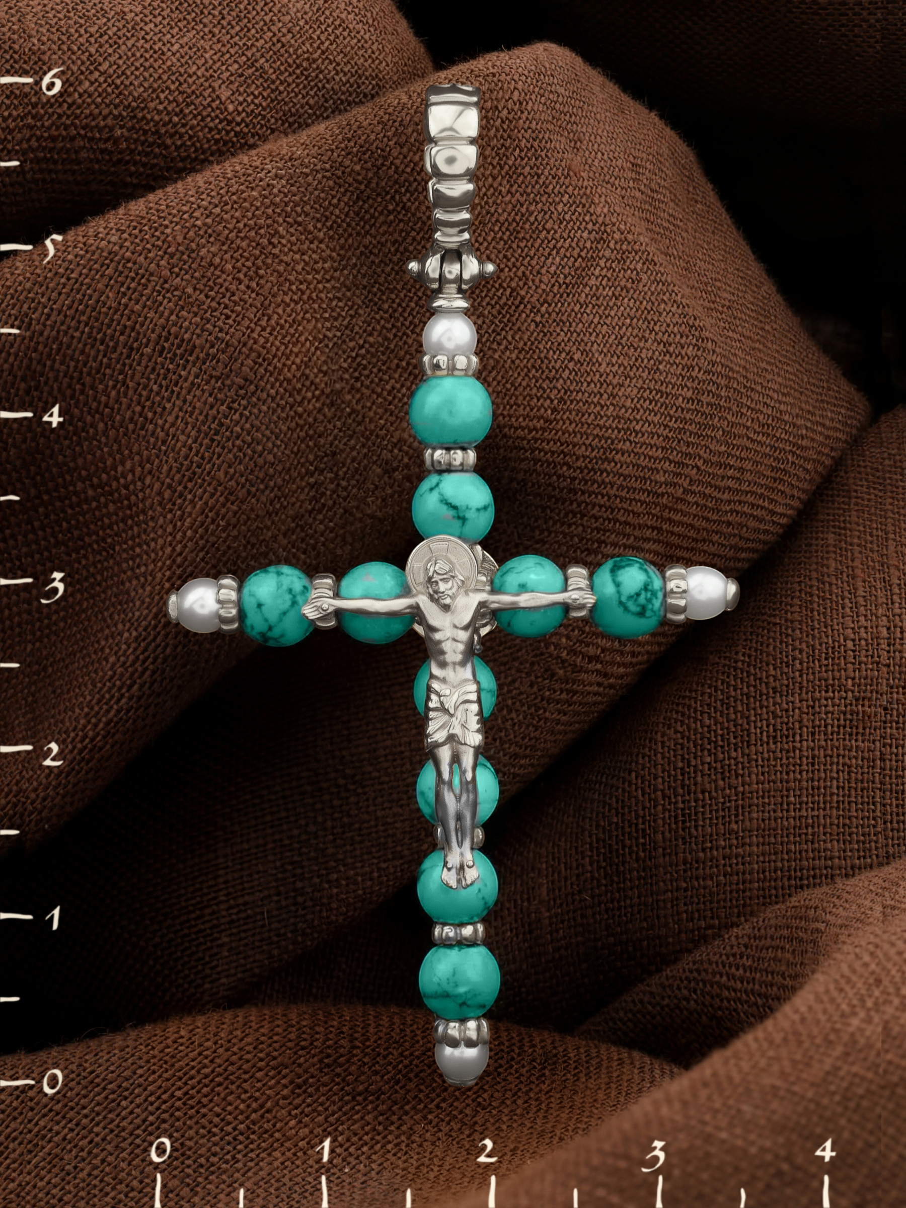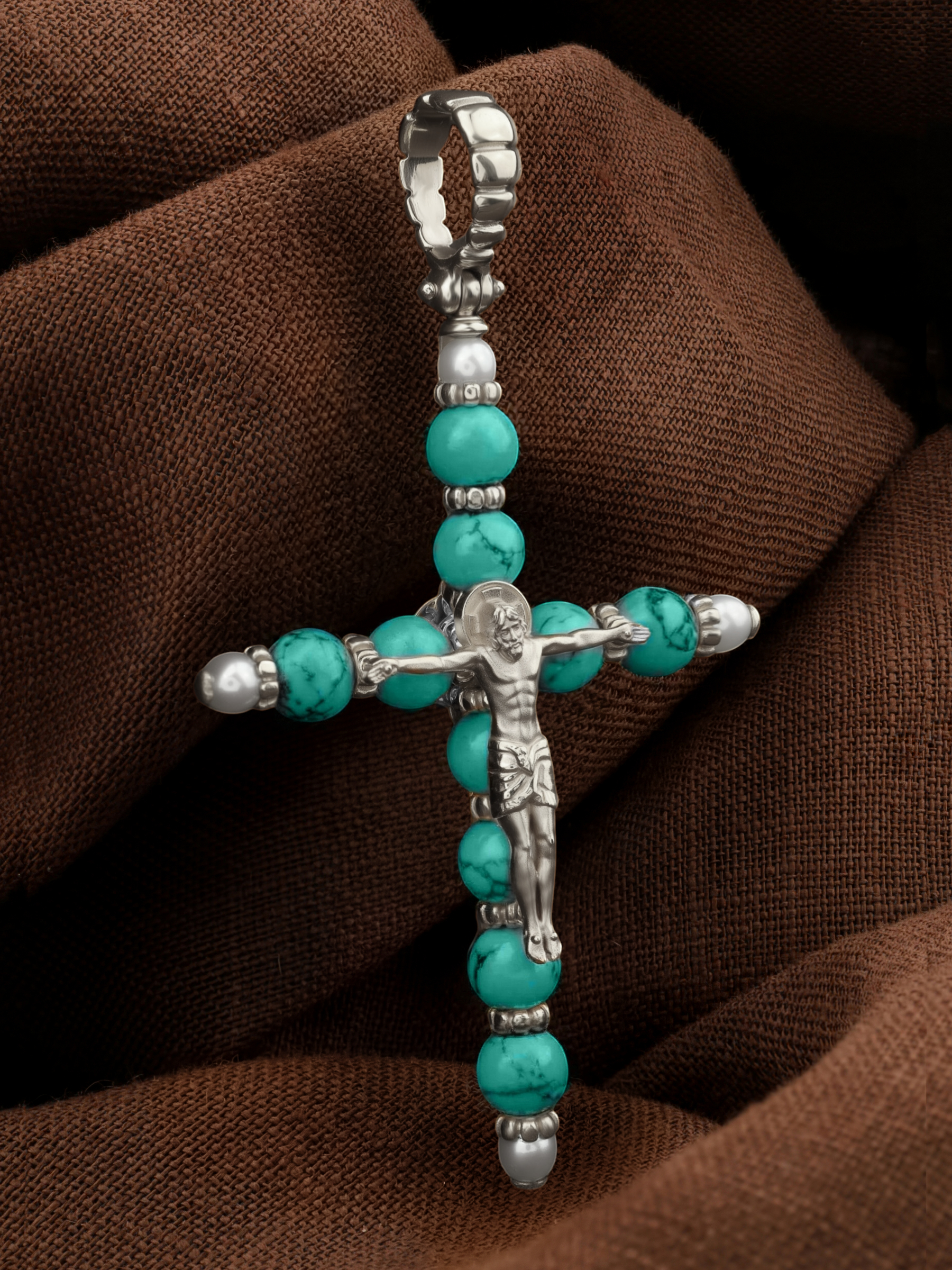 На лицевой стороне креста изображено Распятие Господа и Спасителя нашего Иисуса Христа. Своими крестными страданиями Господь смыл наши грехи, покрыл наш долг перед Богом или, на языке Писания, нас «искупил». В Голгофе сокрыта непостижимая тайна бесконечной правды и любви Бога. Крест стал символом победы добра над злом, жизни над смертью, напоминанием бесконечной Божьей любви, предметом радости. Воплотившийся Сын Божий Своею кровью освятил крест и сделал его проводником Своей благодати, источником освящения верующих. На верхней табличке, выше головы Иисуса, расположена надпись, составленная Понтием Пилатом — «IНЦI». Она означает «Иисус Назорей, Царь Иудейский». Надпись «IC» «ХC», означает Иисус Христос, помещаются на разных сторонах поперечной перекладины креста. Христос в Своей Божественной любви, над которой смерть не властна и которая, страдая, и не страдает в обычном смысле, простирает к людям со Креста Свои объятия, в которые призывается и привлекается весь мир. Поэтому Тело Его не висит, а торжественно покоится на Кресте.
