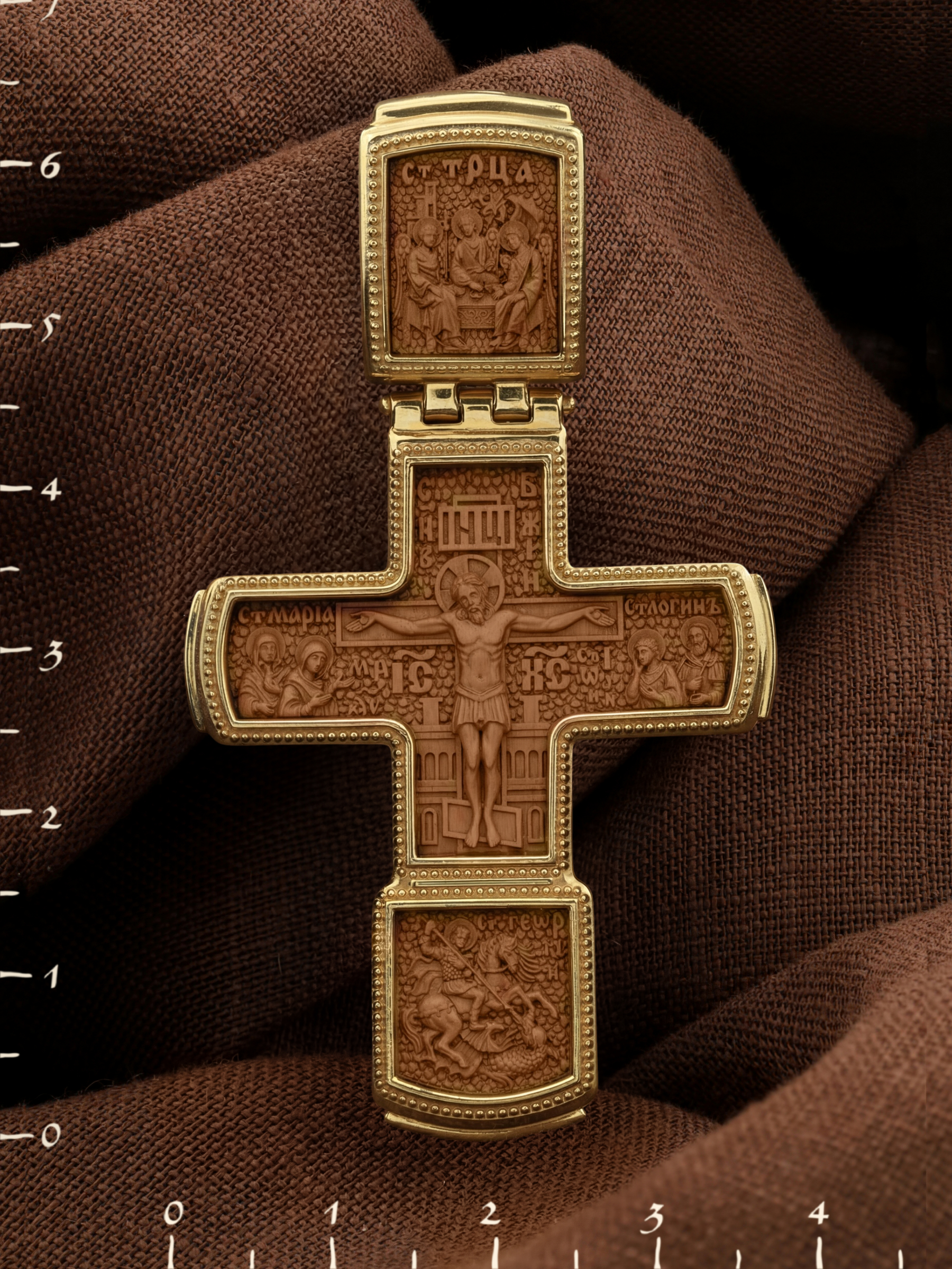 На кресте изображено Распятие Господа нашего Иисуса Христа. Ему предстоят Святая Мария Магдалина, Пресвятая Богородица, апостол Иоанн и Святой Иосиф, свидетели крестных страданий Господа. На оглавии помещена икона Святой Троицы, на которой запечатлено явление Триединого Бога праотцу Аврааму в виде трех ангелов. В нижнем клейме изображено Чудо Святого Георгия о змие. Великомученик Георгий почитается как покровитель воинов, защитник от злых сил, помощник в духовной борьбе.
