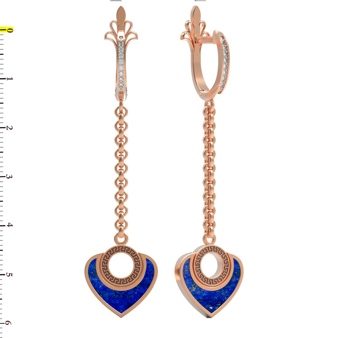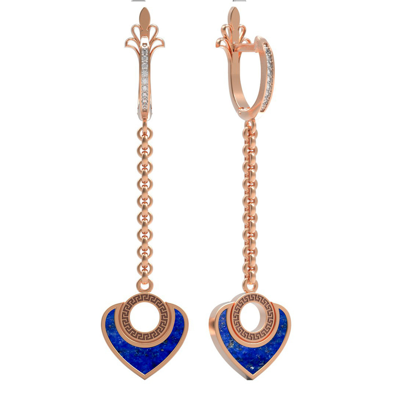 В центре композиции — подвески в форме сердца, инкрустированные глубоким синим лазуритом, который эффектно контрастирует с теплым блеском металла. Ювелирная композиция дополнена 18 сверкающими вставками из белого фианита круглой формы, которые мягко переливаются при каждом движении. Изящная цепочка придает серьгам динамику и легкость.