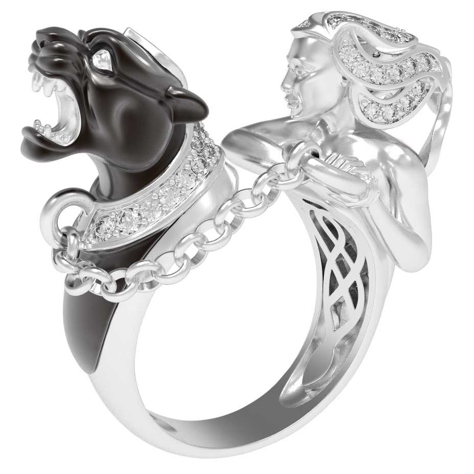 Кольцо из белого золота 585 пробы из коллекции De Luxe — Мифология станет ярким акцентом вашего образа и настоящим произведением ювелирного искусства. Дизайн изделия выполнен в мифологической тематике: оригинальная композиция объединяет грациозную фигуру и величественного хищника, соединенных изящной цепочкой. Это украшение создано для тех, кто ценит смелые формы и высокое мастерство исполнения.