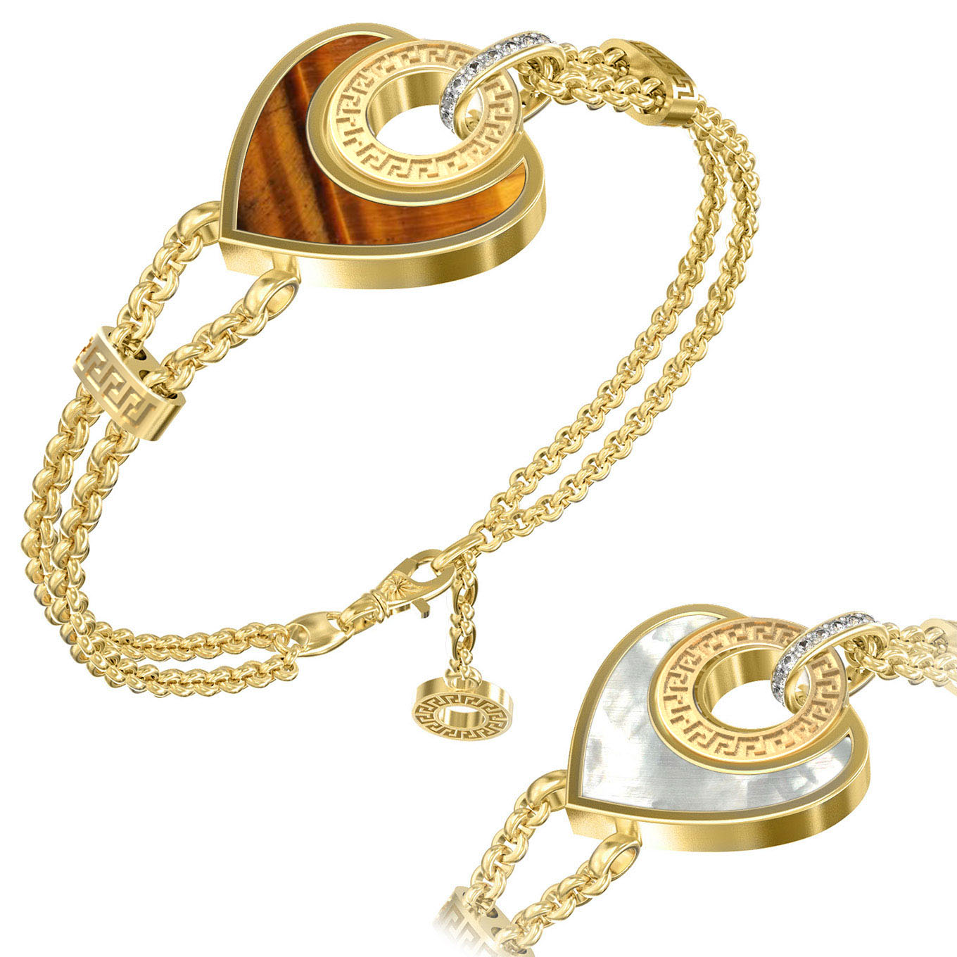 Эффектный браслет из лимонного золота 585 пробы станет центральным акцентом вашего образа. Изделие входит в коллекцию De Luxe — С любовью, отличающуюся утонченным дизайном и вниманием к деталям. Главной особенностью украшения является центральная часть в виде сердец, которые гармонично сочетают в себе благородный металл и природные материалы. В оформлении использованы 17 вставок: глубокий оранжевый тигровый глаз и нежный перламутр создают контрастный и притягательный визуальный эффект, подчеркнутый блеском прозрачных фианитов. Круглые вставки дополняют общую композицию, добавляя изделию завершенность.