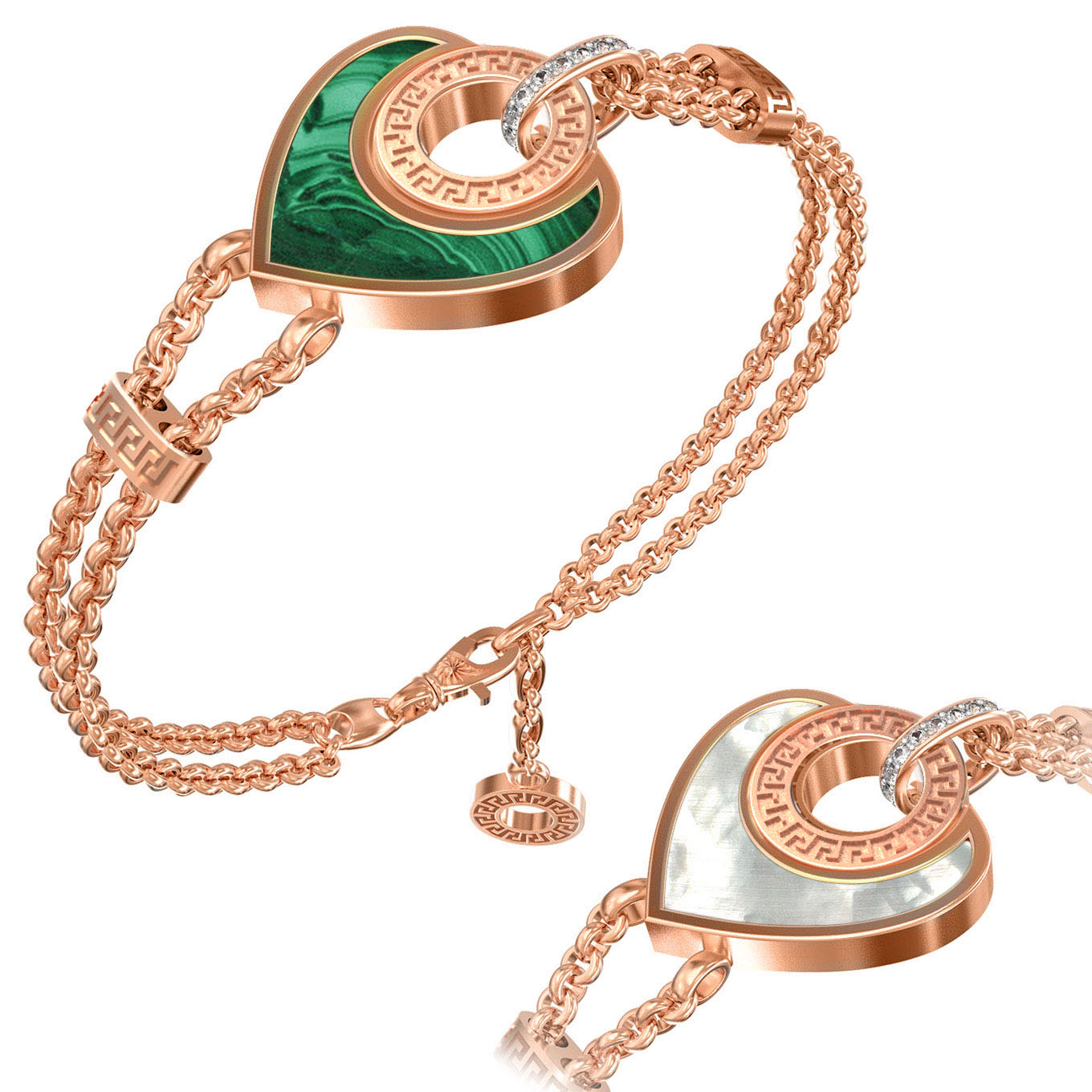 Изысканный браслет из красного золота 585 пробы — это воплощение гармонии и утонченного стиля. Данное украшение из коллекции De Luxe — С любовью станет идеальным дополнением образа, подчеркивая индивидуальность владельца. Дизайн изделия, обыгрывающий тематику сердец, придает ему особую романтичность и выразительность. В центре композиции расположены контрастные вставки: благородный зеленый малахит и нежный перламутр, создающие завораживающую игру оттенков.