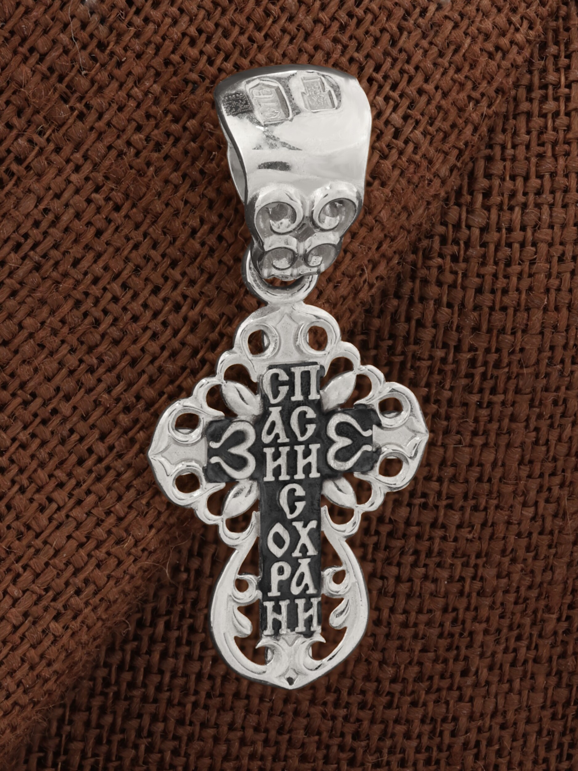 На оборотной стороне креста написана молитва: «Спаси и сохрани». Крест украшен орнаментом.