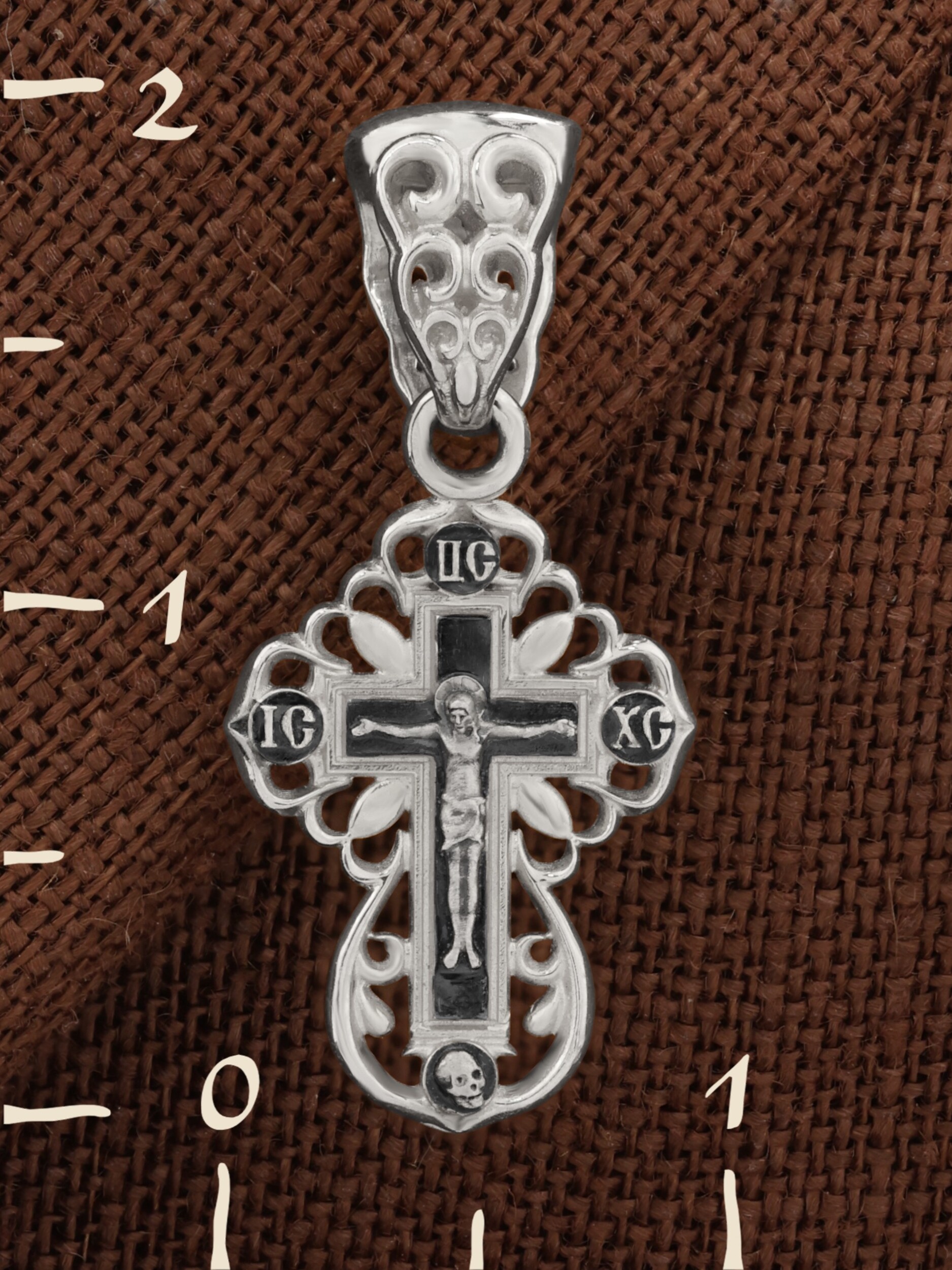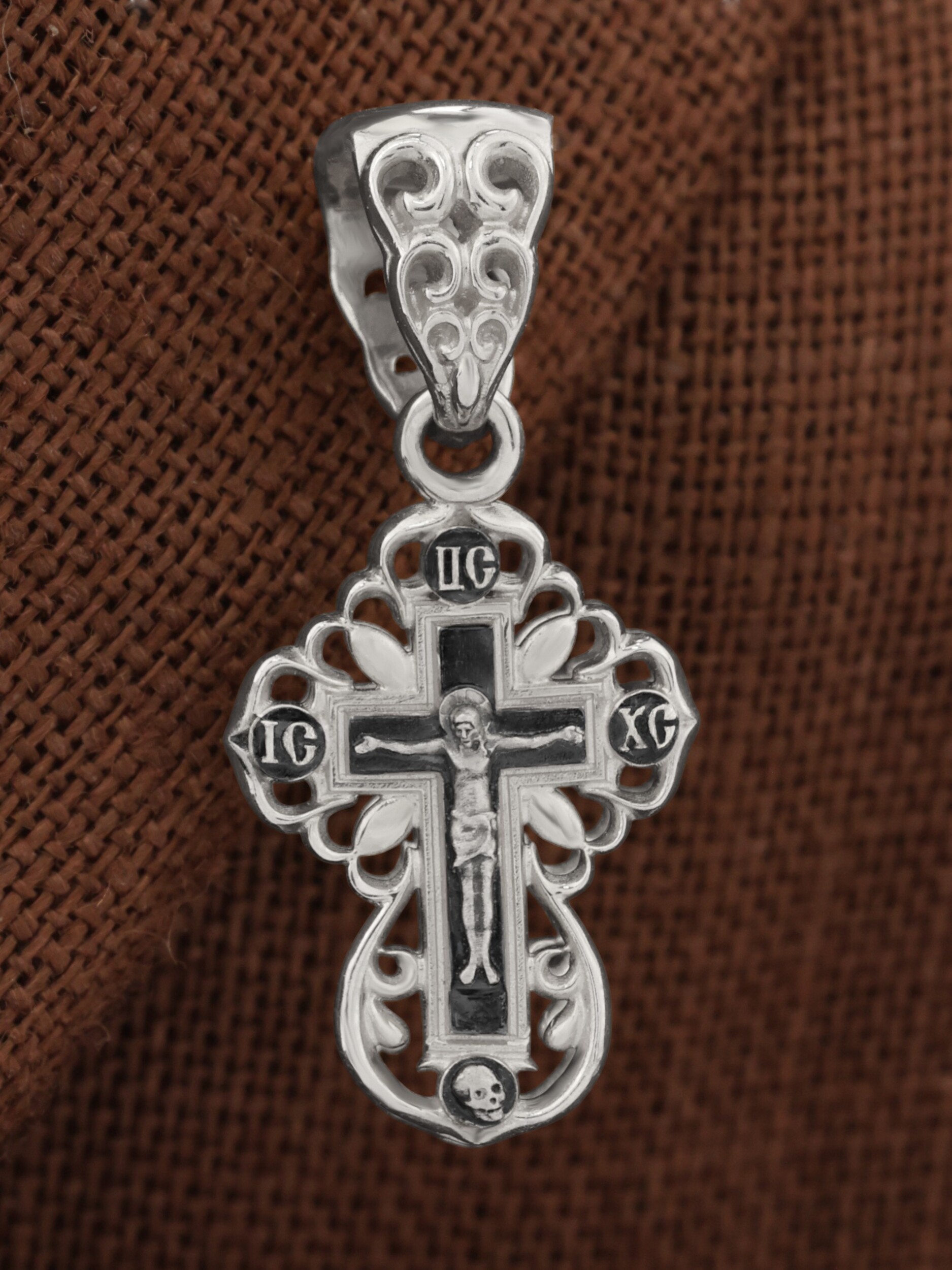 На лицевой стороне креста изображено Распятие Господа и Спасителя нашего Иисуса Христа. Своими крестными страданиями Господь смыл наши грехи, покрыл наш долг перед Богом или, на языке Писания, нас «искупил». В Голгофе сокрыта непостижимая тайна бесконечной правды и любви Бога. Крест стал символом победы добра над злом, жизни над смертью, напоминанием бесконечной Божьей любви, предметом радости. Воплотившийся Сын Божий Своею кровью освятил крест и сделал его проводником Своей благодати, источником освящения верующих. Над вершиной Распятия помещена надпись «Царь Славы». Надпись «IC» «ХC», означает Иисус Христос, помещаются на разных сторонах поперечной перекладины креста. В основании Распятия различается череп– это голова Адама. Христос в Своей Божественной любви, над которой смерть не властна и которая, страдая, и не страдает в обычном смысле, простирает к людям со Креста Свои объятия, в которые призывается и привлекается весь мир. Поэтому Тело Его не висит, а торжественно покоится на Кресте.