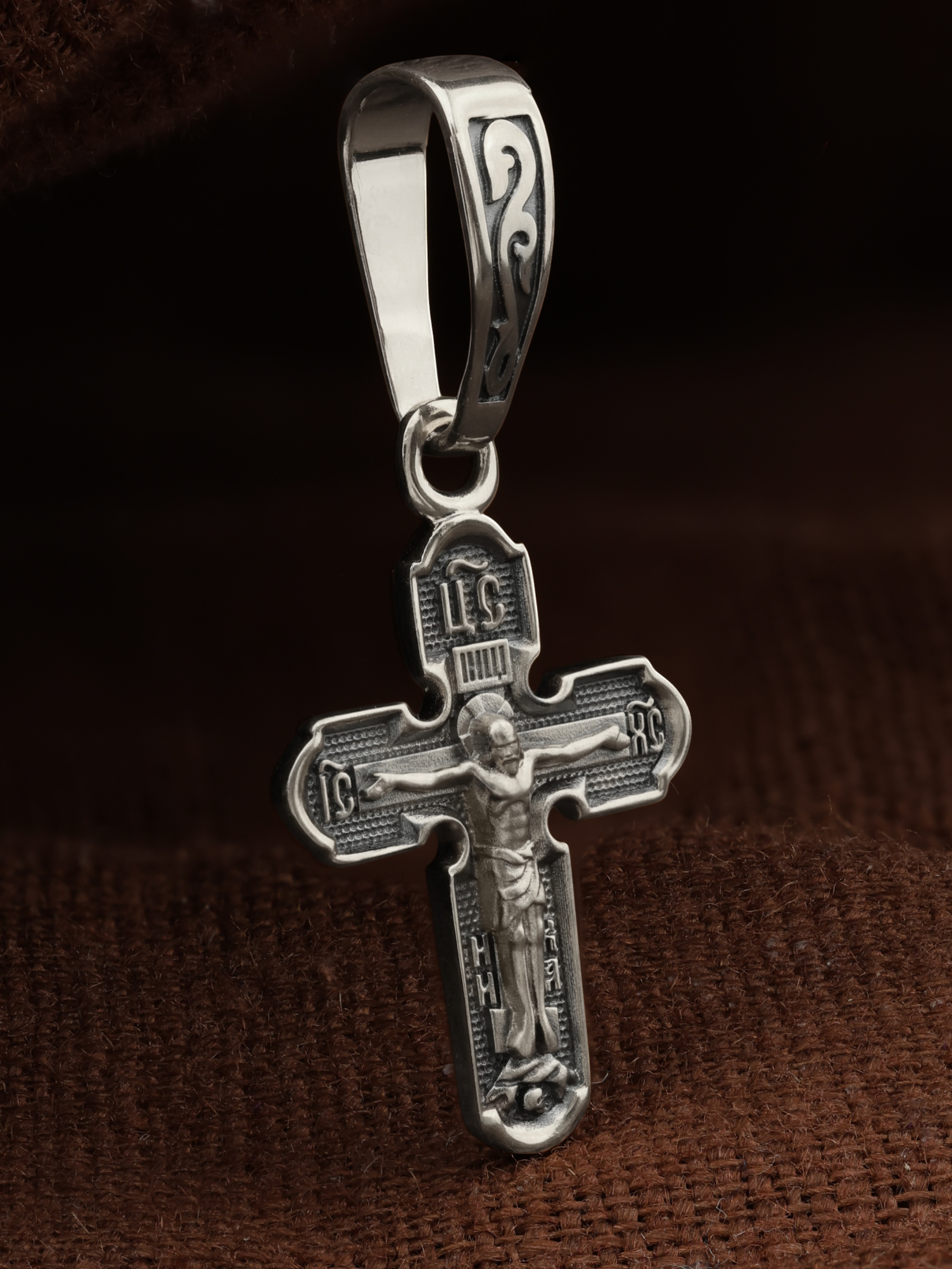 На лицевой стороне креста изображено Распятие Господа и Спасителя нашего Иисуса Христа, отдавшего Себя на смерть для искупления грехов мира. Крест является символом жертвенной любви Всеблагого Бога к падшим людям, всепобеждающим духовным оружием христиан, основанием и средоточием церковной жизни. Над вершиной Распятия помещена надпись «Царь Славы». На верхней перекладине расположена надпись «IНЦI». Она символизирует титло — табличку, на которой, согласно Евангелию, было начертано: Иисус Назорей, Царь Иудейский. Надпись «IC» «ХC»», означает Иисус Христос, помещаются на разных сторонах поперечной перекладины креста. Ниже помещена надпись «НИКА», что означает «победитель». Крест стоит на горе камней, символизирующих Голгофу. Под подножием Креста изображена покоящаяся голова (череп) Адама.