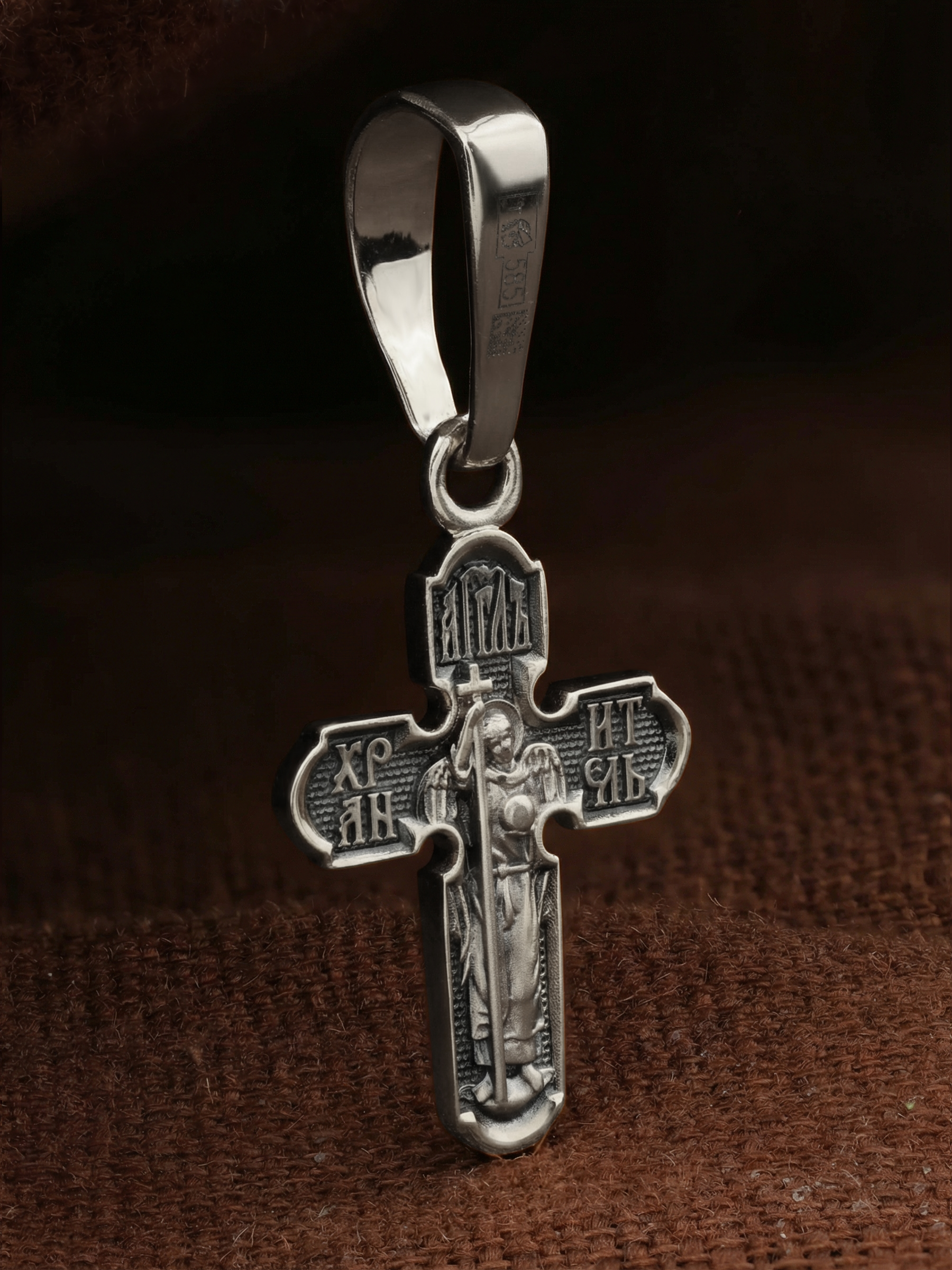 На оборотной стороне креста изображен святой Ангел-Хранитель в виде прекрасного юноши держащего в правой руке крест, а в левой — сферу. Ангел-Хранитель — это Ангел приставляемый Богом к человеку при крещении для охраны и помощи в добрых делах. Невидимо пребывая при нас постоянно, он, руководствуя нас ко спасению, не только по нашему желанию таинственно наставляет нас на все доброе и полезное, не только возносит наши молитвы к Богу, но еще и сам от себя охраняют и защищают нас от врагов видимых и невидимых, ходатайствует за нас пред Богом.