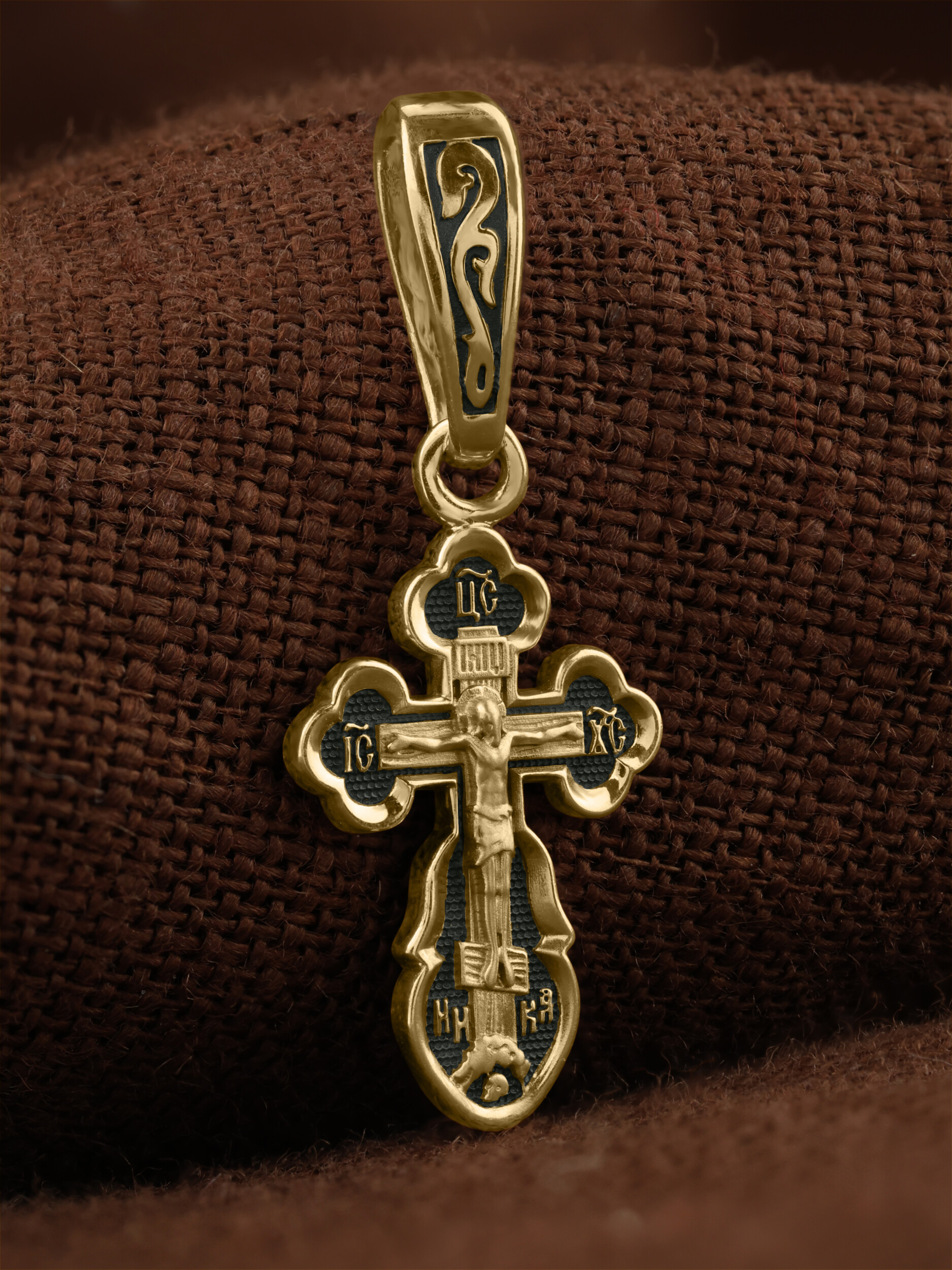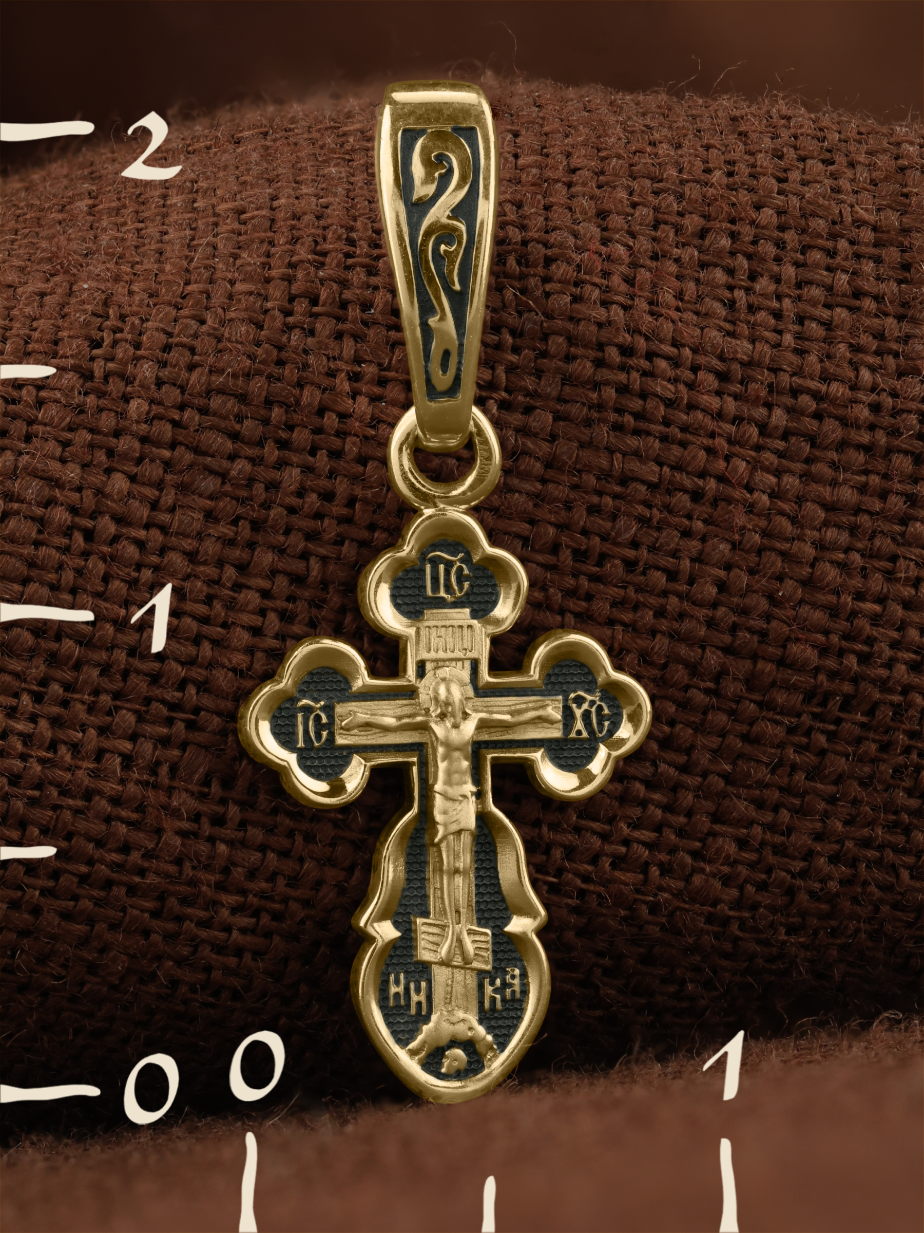 На лицевой стороне креста изображено Распятие Господа и Спасителя нашего Иисуса Христа, отдавшего Себя на смерть для искупления грехов мира. Крест является символом жертвенной любви Всеблагого Бога к падшим людям, всепобеждающим духовным оружием христиан, основанием и средоточием церковной жизни. Над вершиной Распятия помещена надпись «Царь Славы». На верхней перекладине расположена надпись «IНЦI». Она символизирует титло — табличку, на которой, согласно Евангелию, было начертано: Иисус Назорей, Царь Иудейский. Надпись «IC» «ХC»», означает Иисус Христос, помещаются на разных сторонах поперечной перекладины креста. Ниже помещена надпись «НИКА», что означает «победитель». Крест стоит на горе камней, символизирующих Голгофу. Под подножием Креста изображена покоящаяся голова (череп) Адама.