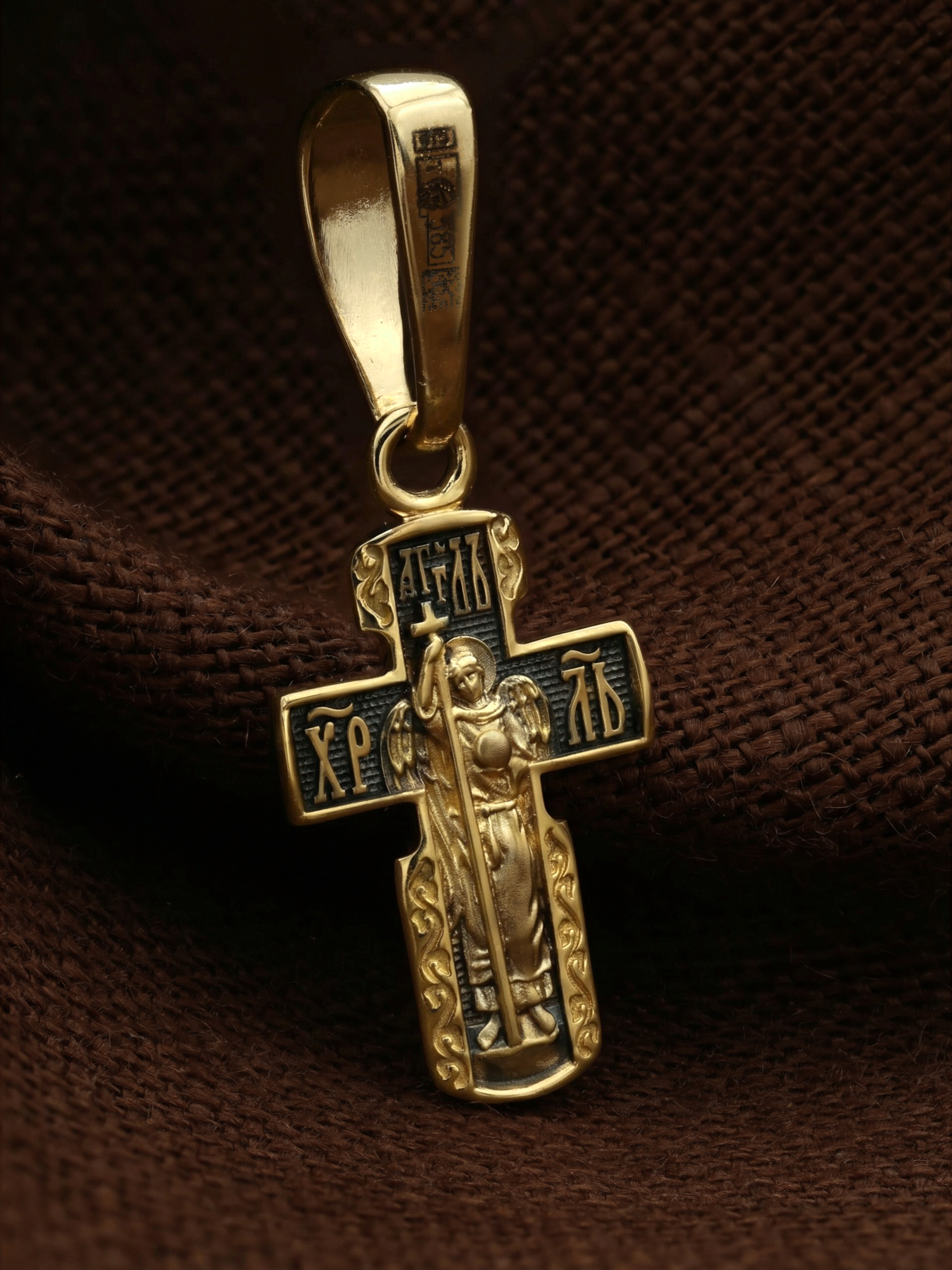 На оборотной стороне креста изображен святой Ангел-Хранитель в виде прекрасного юноши держащего в правой руке крест, а в левой — сферу. Ангел-Хранитель — это Ангел приставляемый Богом к человеку при крещении для охраны и помощи в добрых делах. Невидимо пребывая при нас постоянно, он, руководствуя нас ко спасению, не только по нашему желанию таинственно наставляет нас на все доброе и полезное, не только возносит наши молитвы к Богу, но еще и сам от себя охраняют и защищают нас от врагов видимых и невидимых, ходатайствует за нас пред Богом.
