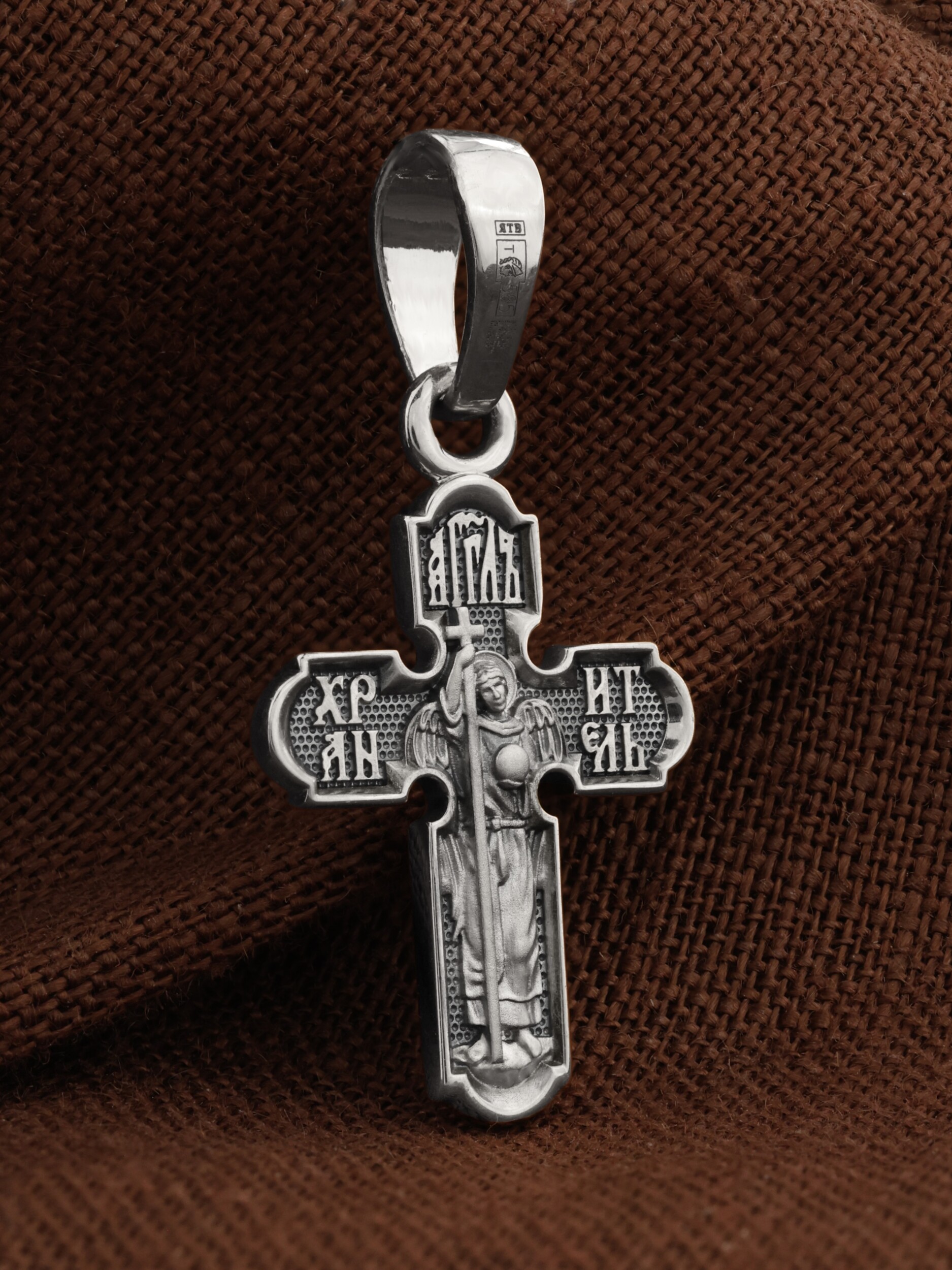 На оборотной стороне креста изображен святой Ангел-Хранитель в виде прекрасного юноши держащего в правой руке крест, а в левой — сферу. Ангел-Хранитель — это Ангел приставляемый Богом к человеку при крещении для охраны и помощи в добрых делах. Невидимо пребывая при нас постоянно, он, руководствуя нас ко спасению, не только по нашему желанию таинственно наставляет нас на все доброе и полезное, не только возносит наши молитвы к Богу, но еще и сам от себя охраняют и защищают нас от врагов видимых и невидимых, ходатайствует за нас пред Богом.