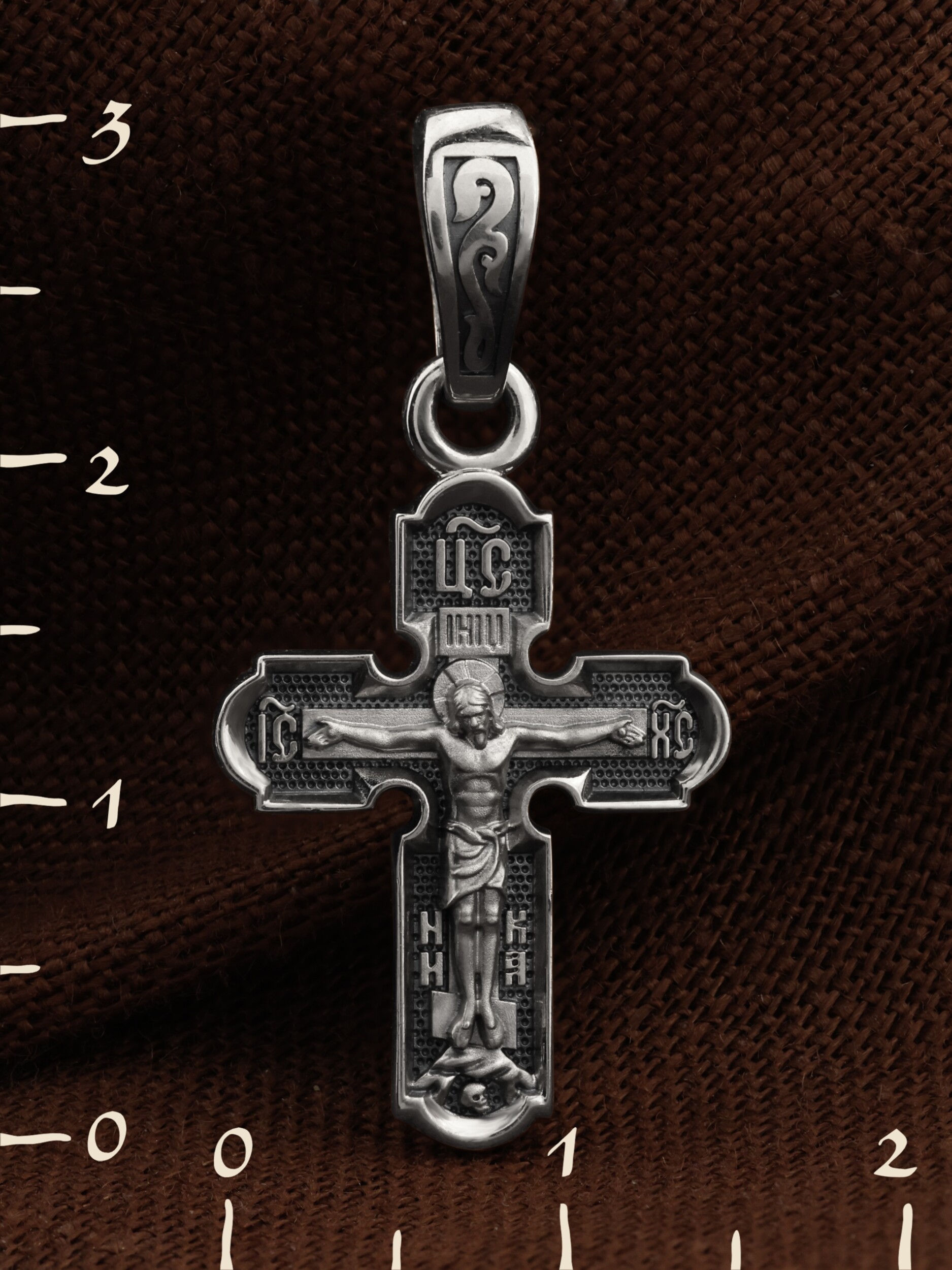 На лицевой стороне креста изображено Распятие Господа и Спасителя нашего Иисуса Христа, отдавшего Себя на смерть для искупления грехов мира. Крест является символом жертвенной любви Всеблагого Бога к падшим людям, всепобеждающим духовным оружием христиан, основанием и средоточием церковной жизни. Над вершиной Распятия помещена надпись «Царь Славы». На верхней перекладине расположена надпись «IНЦI». Она символизирует титло — табличку, на которой, согласно Евангелию, было начертано: Иисус Назорей, Царь Иудейский. Надпись «IC» «ХC»», означает Иисус Христос, помещаются на разных сторонах поперечной перекладины креста. Ниже помещена надпись «НИКА», что означает «победитель». Крест стоит на горе камней, символизирующих Голгофу. Под подножием Креста изображена покоящаяся голова (череп) Адама.