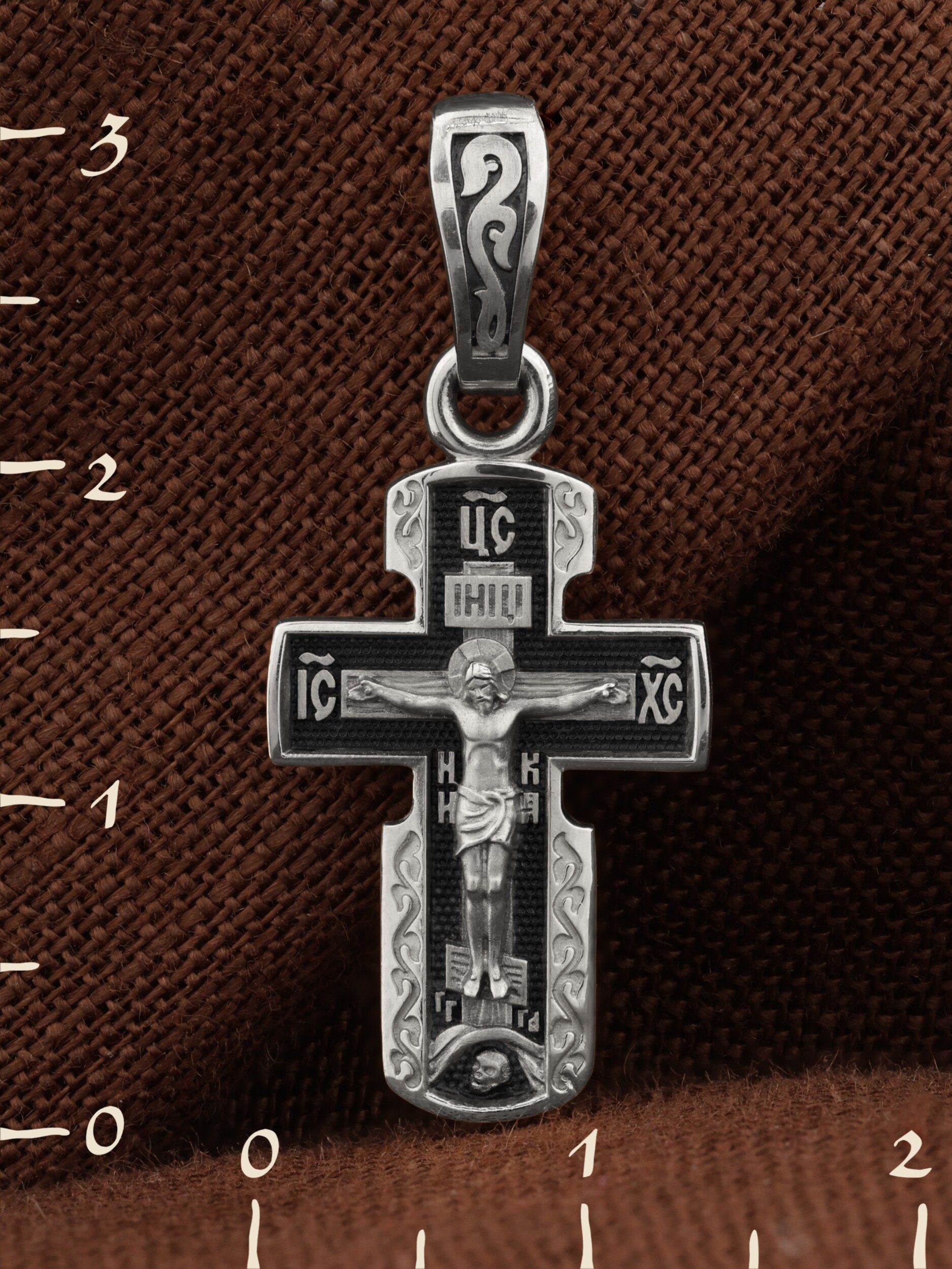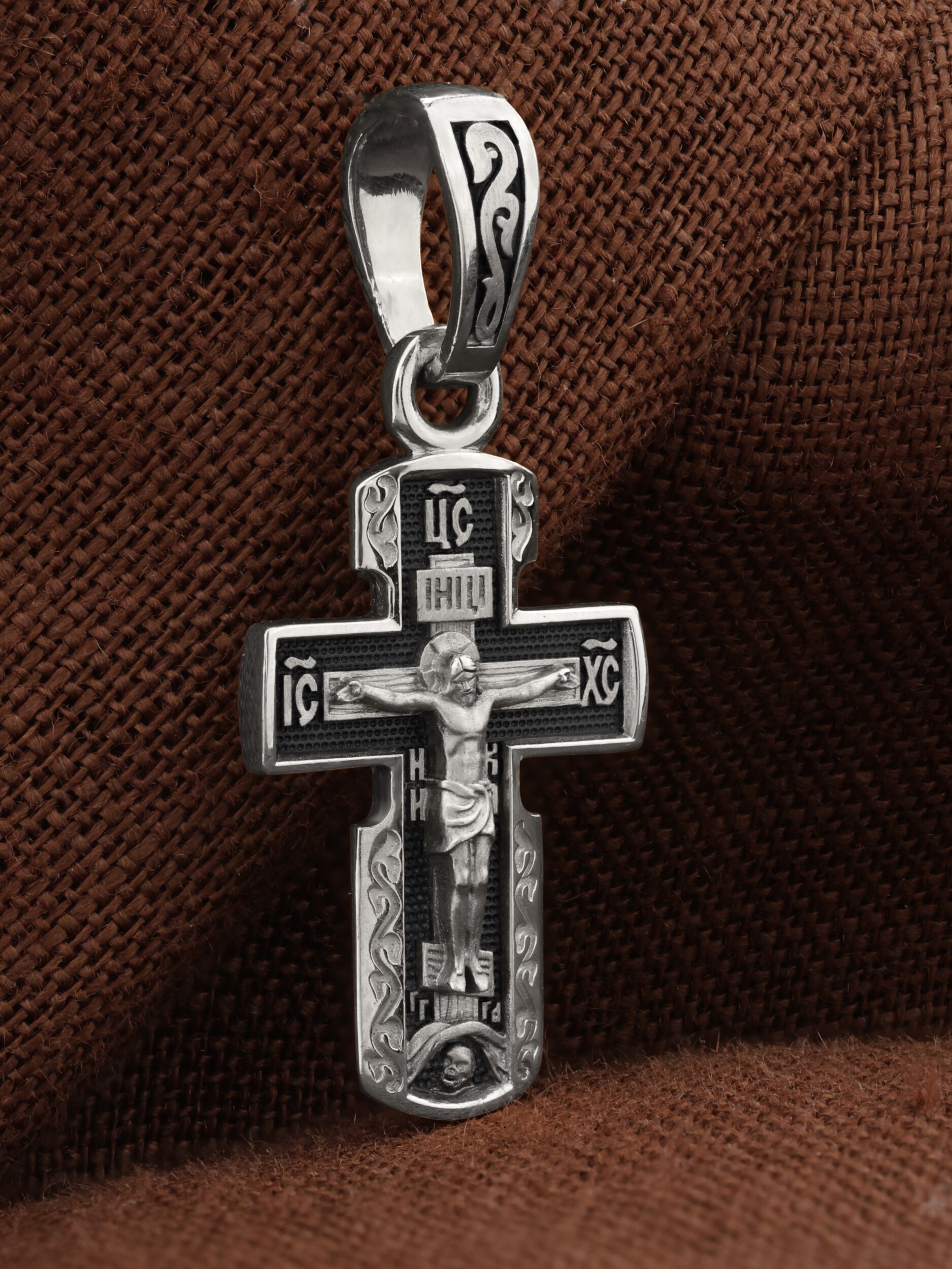 На лицевой стороне креста изображено Распятие Господа и Спасителя нашего Иисуса Христа, отдавшего Себя на смерть, для искупления грехов мира. Крест является символом жертвенной любви Всеблагого Бога к падшим людям, всепобеждающим духовным оружием христиан, основанием и средоточием церковной жизни. Над вершиной Распятия помещена надпись «Царь Славы». На верхней перекладине расположена надпись «IНЦI». Она символизирует титло — табличку, на которой, согласно Евангелию, было начертано: Иисус Назорей, Царь Иудейский. Надпись «IC» «ХC», означает Иисус Христос, помещаются на разных сторонах поперечной перекладины креста. Ниже помещена надпись «НИКА», что означает «победитель». Крест стоит на горе камней, символизирующих Голгофу. В ее основании различается череп и надписи «Г.А.» — голова Адама, «Г.Г.» — гора Голгофа.