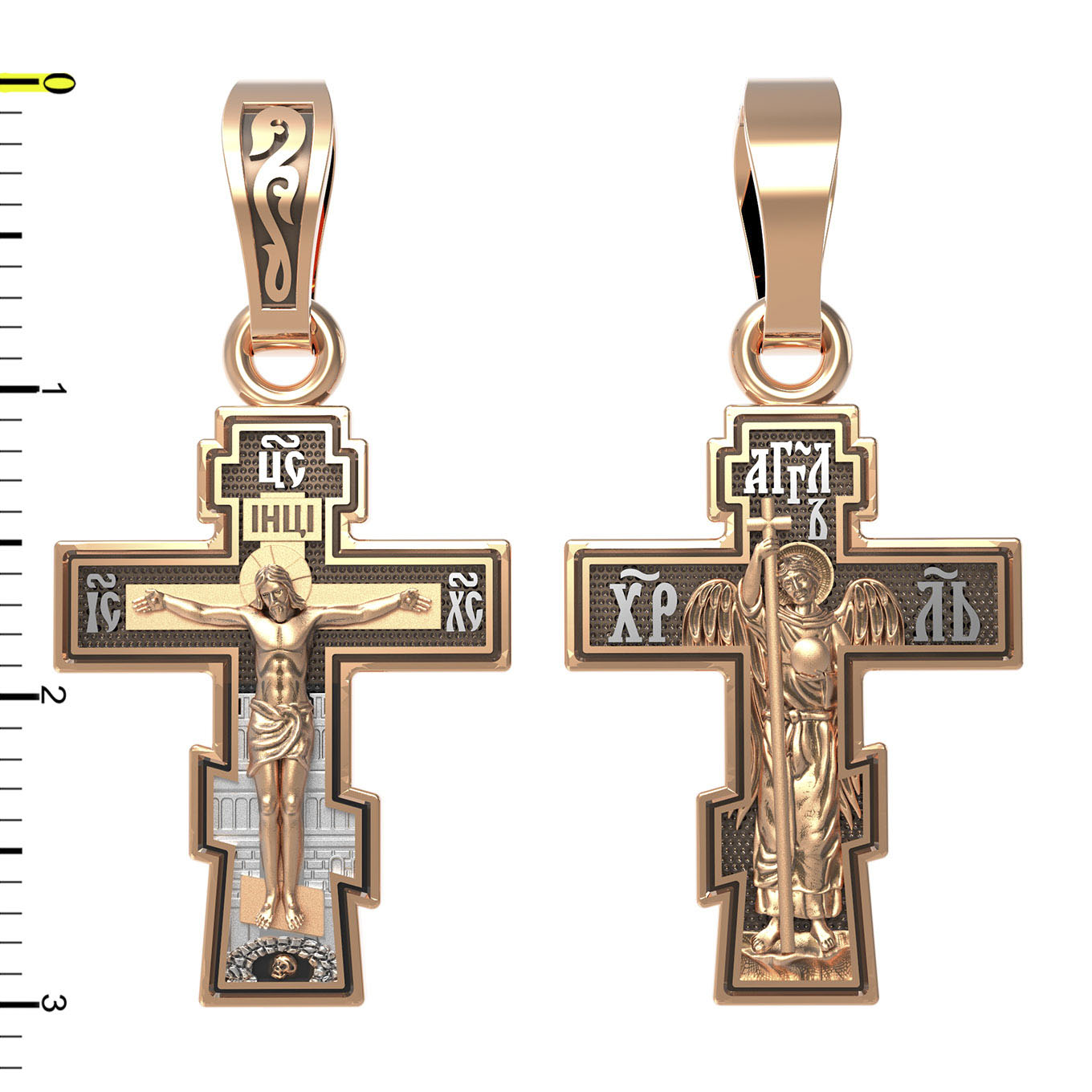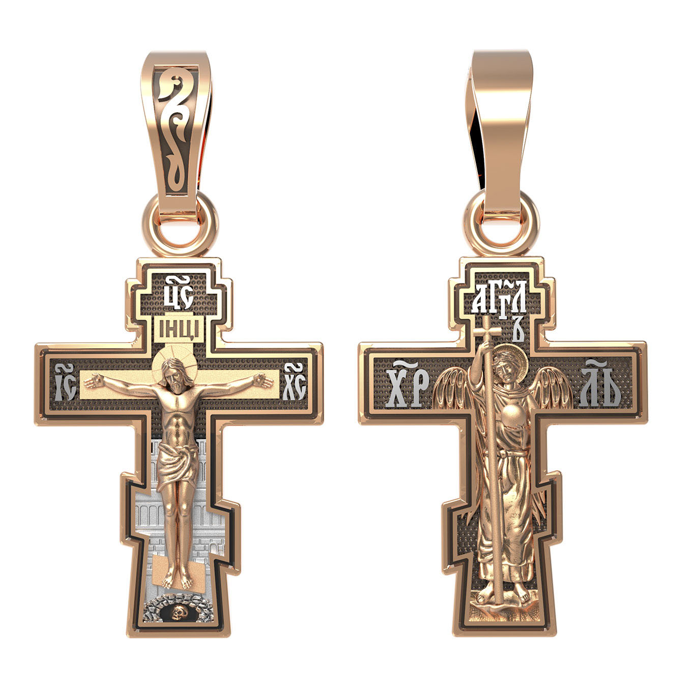 На оборотной стороне креста изображен святой Ангел-Хранитель в виде прекрасного юноши держащего в правой руке крест, а в левой — сферу. Ангел-Хранитель — это Ангел приставляемый Богом к человеку при крещении для охраны и помощи в добрых делах. Невидимо пребывая при нас постоянно, он, руководствуя нас ко спасению, не только по нашему желанию таинственно наставляет нас на все доброе и полезное, не только возносит наши молитвы к Богу, но еще и сам от себя охраняют и защищают нас от врагов видимых и невидимых, ходатайствует за нас пред Богом.