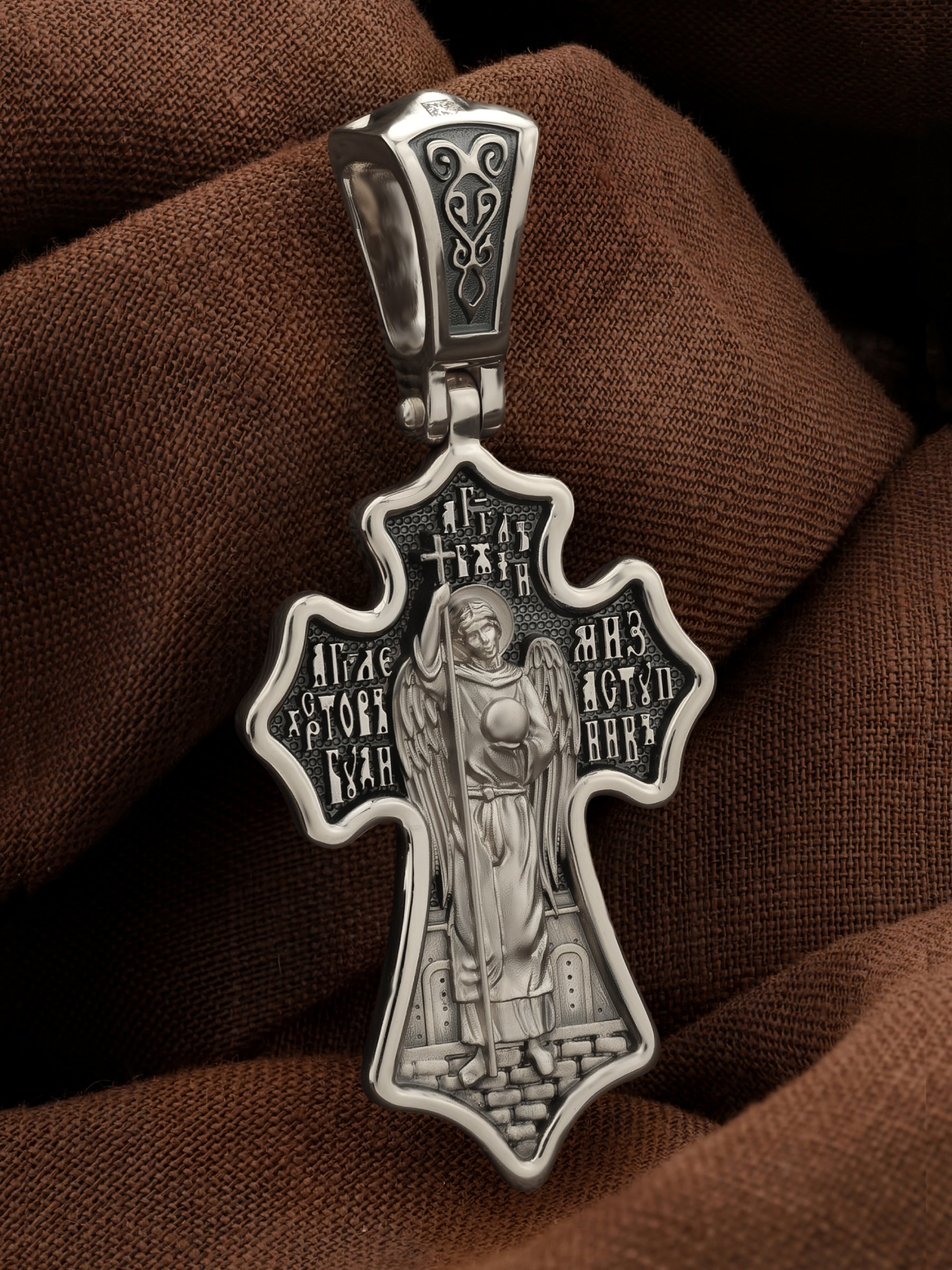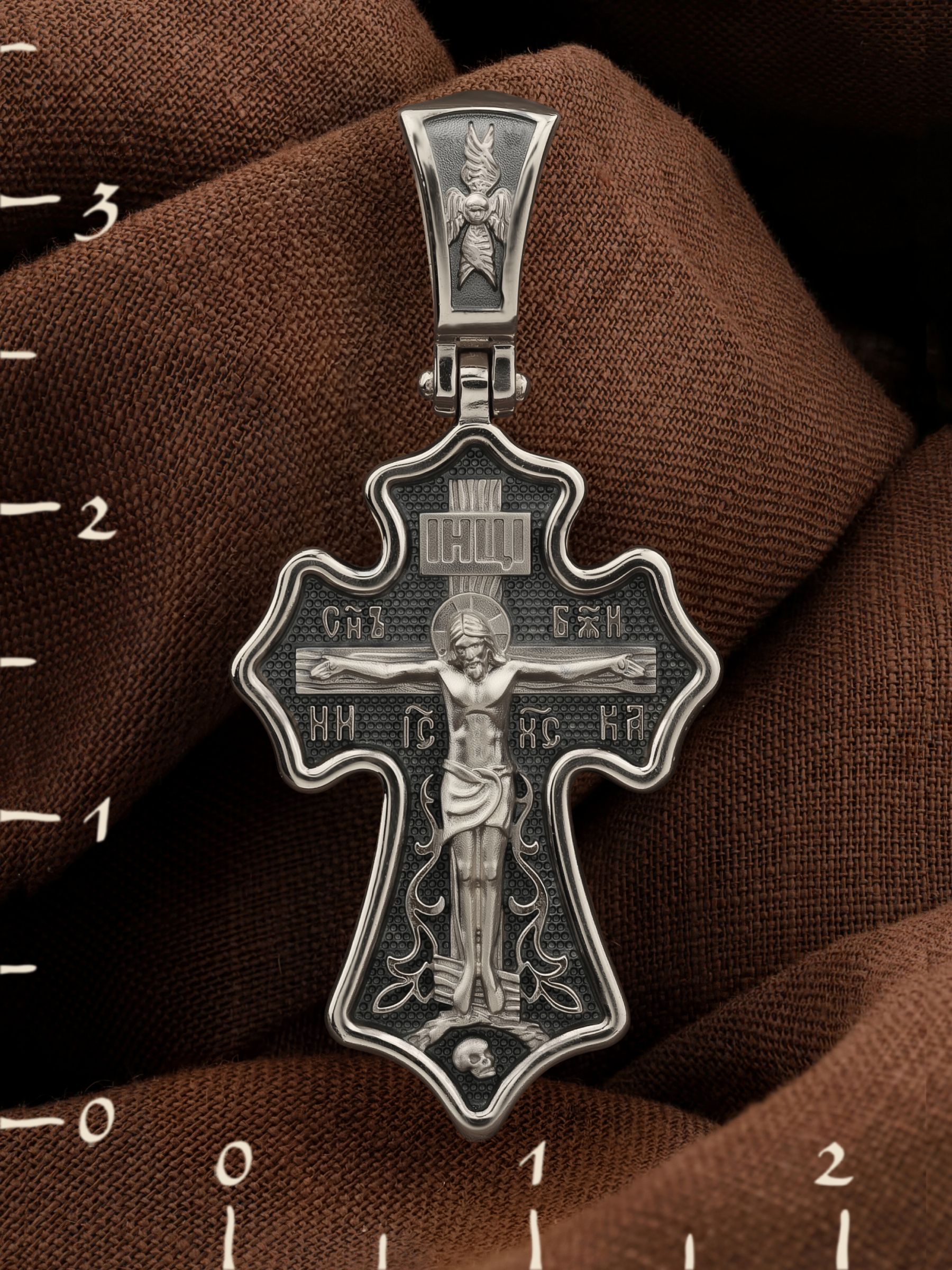 На лицевой стороне креста изображено Распятие, потому что это орудие казни Иисус Христос сделал орудием победы над грехом и смертью. Своими страданиями Он искупил грехи человечества, умерев и сошествовав во ад, победил сатану, освободил души праведников от вечной смерти и открыл им небесные врата рая. Жертва Христа сделала возможным спасение для каждого человека. На православном кресте Христос не умирает, а свободно простирает руки, ладони Иисуса открыты, будто он хочет обнять все человечество, даря им свою любовь и открывая путь к вечной жизни. Верхняя перекладина символизирует собой табличку с надписью «IHЦI» — Иисус Назарянин Царь Иудейский. Над перекладиной пишется словосочетание «СНЪ БЖIЙ» — СЫН БОЖИЙ. Ниже перекладины пишется сокращенно имя Спасителя «IC XC» — Иисус Христос и слово «НИКА» (греч. — Победитель). Возвышение, на котором стоит Крест, символизирует гору Голгофу, на которой произошло Распятие. У подножия Креста изображают прах Адама, обозначенный черепом. На кулонном кольце изображен шестикрылый Серафим — самый приближенный к Господу Ангел.